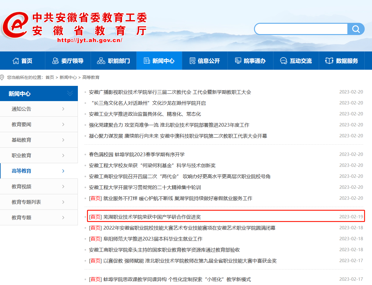 近日,中国产学研合作促进奖评选结束,芜湖职业技术学院荣获2022年中国产学研合作促进奖。本年度全国共有4家高职院校获得该奖项,学校是安徽省唯一获奖高职院校,这充分体现了社会对学校在搭建产教平台、创新科研组织模式、促进科技成果转化、提升科研育人等方面工作的肯定。