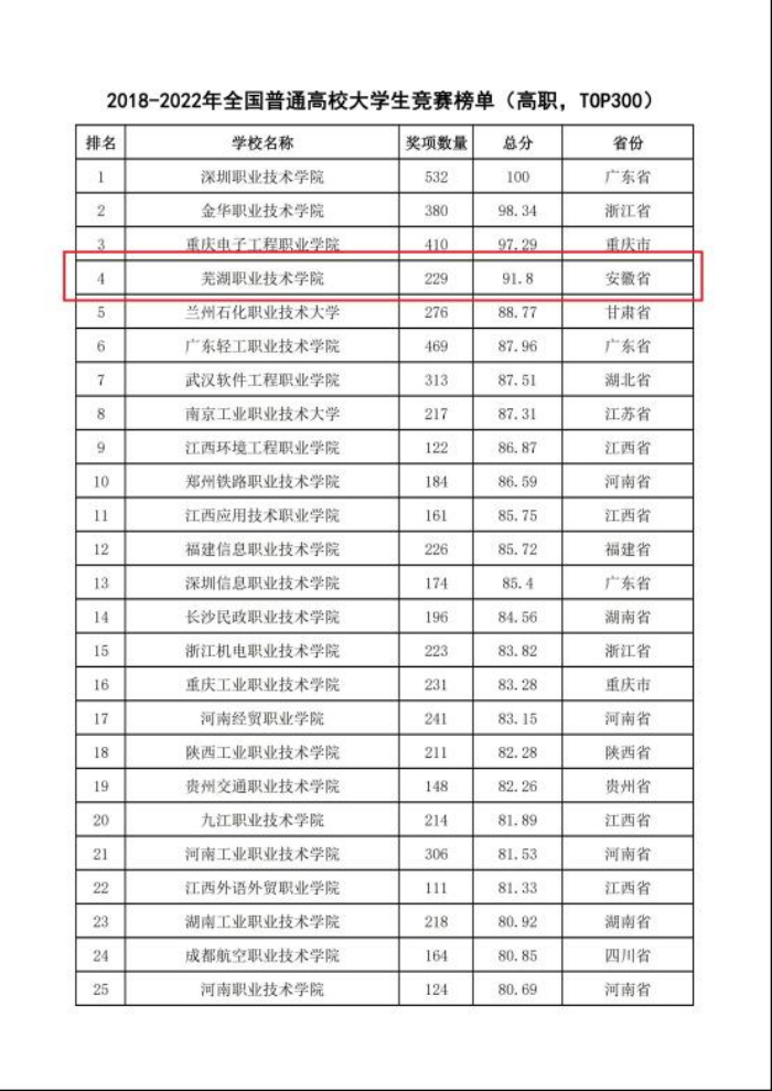 3月22日,中国高等教育学会高校竞赛评估与管理体系研究专家工作组发布《2022全国普通高校大学生竞赛分析报告》(以下简称《分析报告》),其中包含普通本科院校大学生竞赛榜单13个、高职院校大学生竞赛榜单11个、省份大学生竞赛榜单3个。在《2018-2022年全国普通高校大学生竞赛榜单(高职)前300》中,芜湖职业技术学院以总分91.8,稳居全国第四位,中部地区高职院校第一位,安徽省第一名;在《全国普通高校大学生竞赛七轮总榜单(高职)前300》中,该校以总分87.43,位居全国第八位,安徽省第一名。