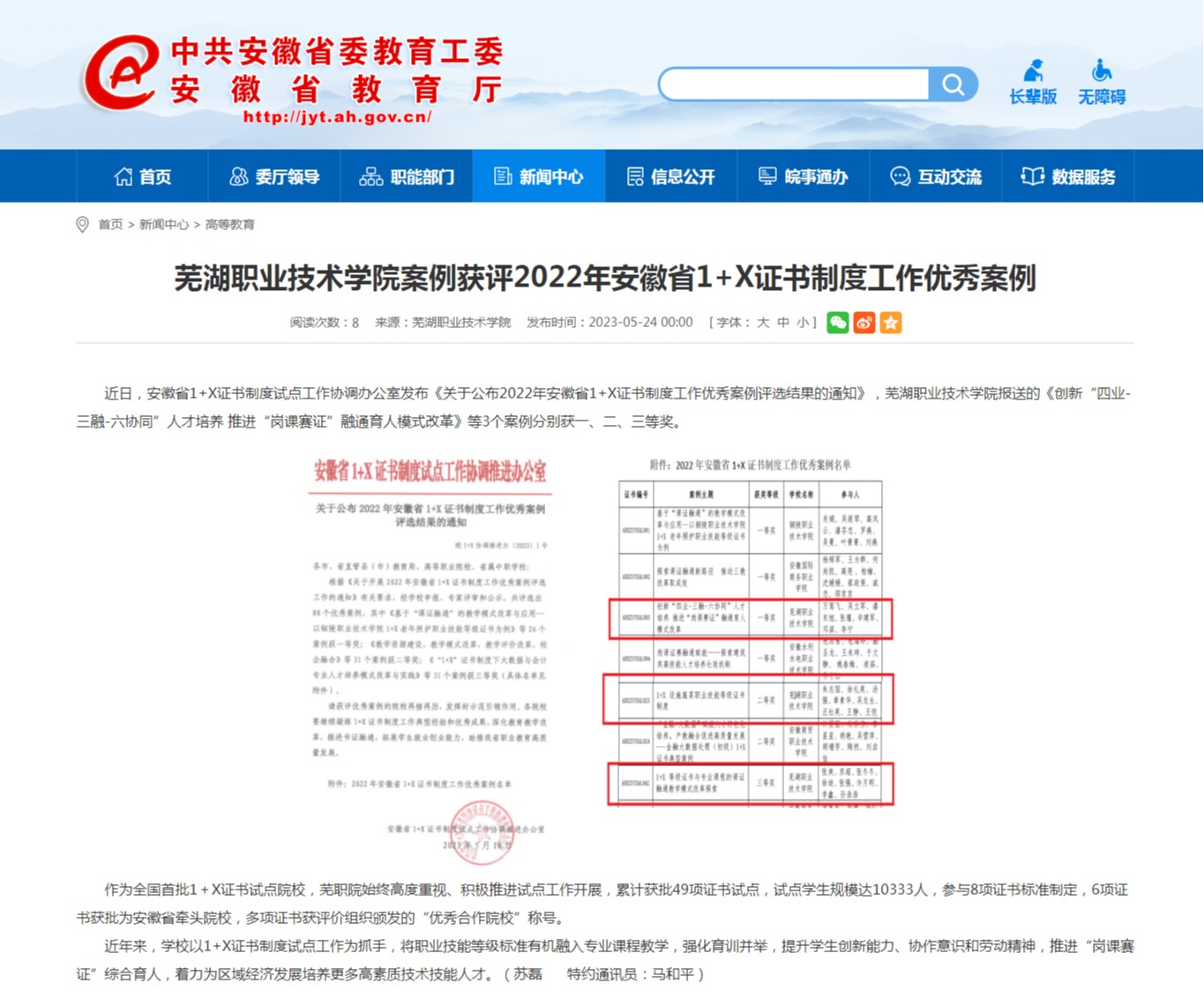 近日,安徽省1+X证书制度试点工作协调办公室发布《关于公布2022年安徽省1+X证书制度工作优秀案例评选结果的通知》,芜湖职业技术学院报送的《创新“四业-三融-六协同”人才培养 推进“岗课赛证”融通育人模式改革》等3个案例分别获一、二、三等奖。