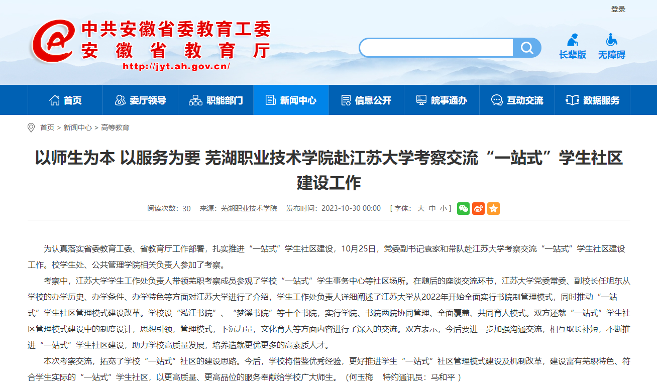 考察中,江苏大学学生工作处负责人带领芜职考察成员参观了学校“一站式”学生事务中心等社区场所。在随后的座谈交流环节,江苏大学党委常委、副校长任旭东从学校的办学历史、办学条件、办学特色等方面对江苏大学进行了介绍,学生工作处负责人详细阐述了江苏大学从2022年开始全面实行书院制管理模式,同时推动“一站式”学生社区管理模式建设改革。学校设“泓江书院”、“梦溪书院”等十个书院,实行学院、书院两院协同管理、全面覆盖、共同育人模式。双方还就“一站式”学生社区管理模式建设中的制度设计,思想引领,管理模式,下沉力量,文化育人等方面内容进行了深入的交流。双方表示,今后要进一步加强沟通交流,相互取长补短,不断推进“一站式”学生社区建设,助力学校高质量发展,培养造就更优更多的高素质人才。