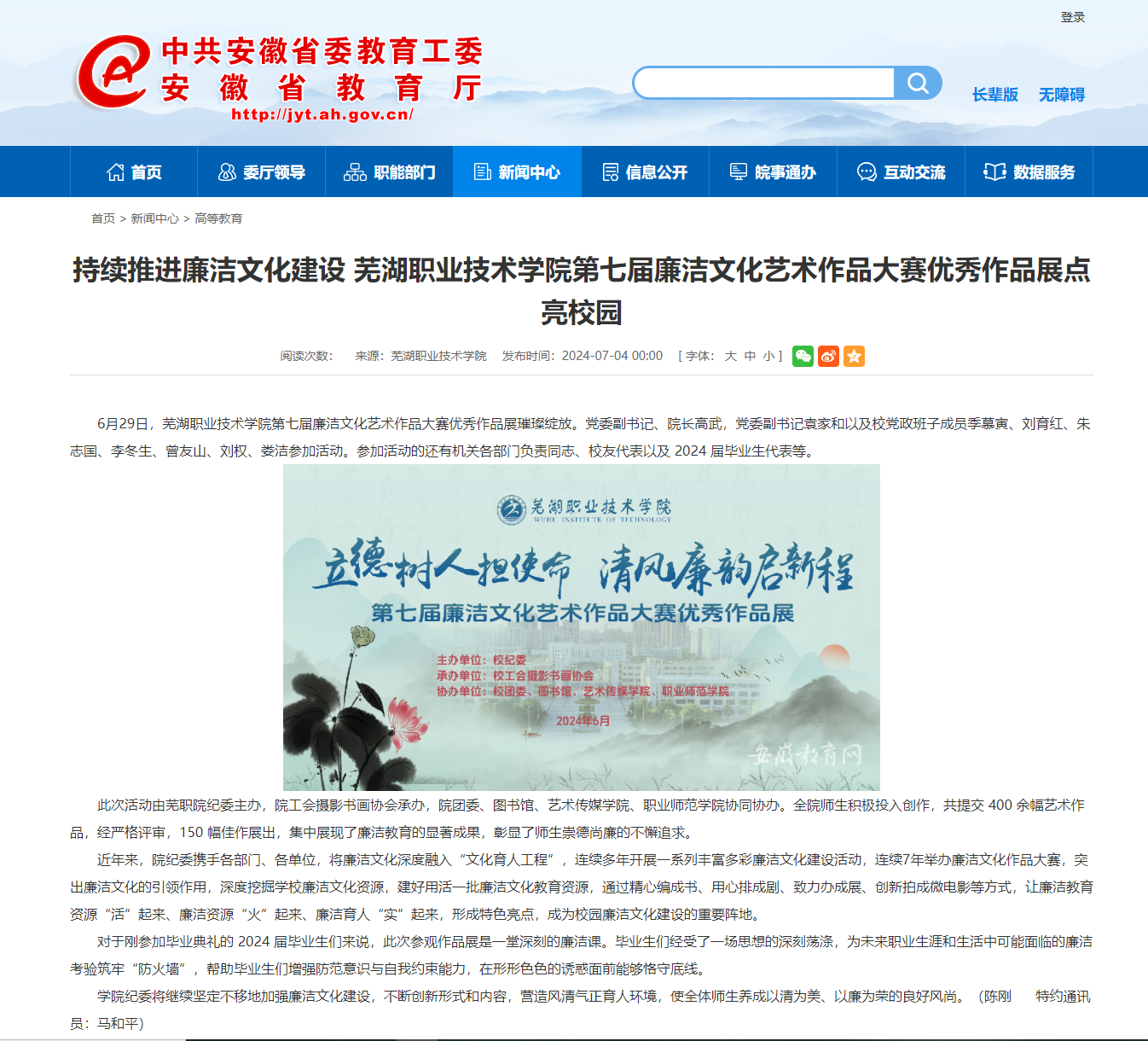 6月29日,芜湖职业技术学院第七届廉洁文化艺术作品大赛优秀作品展璀璨绽放。党委副书记、院长高武,党委副书记袁家和以及校党政班子成员季慕寅、刘育红、朱志国、李冬生、曾友山、刘权、娄洁参加活动。参加活动的还有机关各部门负责同志、校友代表以及 2024 届毕业生代表等。