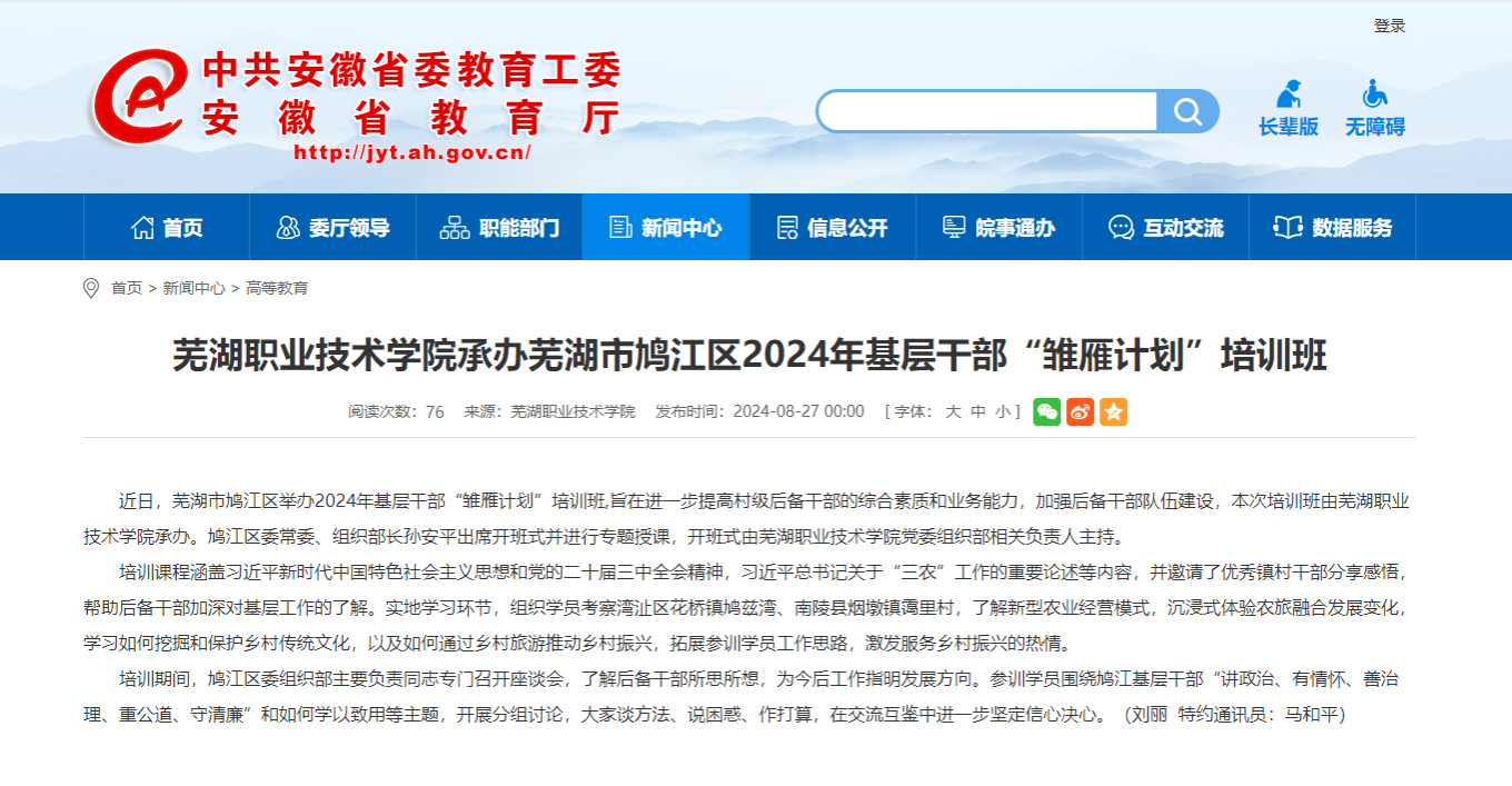 近日,芜湖市鸠江区举办2024年基层干部“雏雁计划”培训班,旨在进一步提高村级后备干部的综合素质和业务能力,加强后备干部队伍建设,本次培训班由芜湖职业技术学院承办。鸠江区委常委、组织部长孙安平出席开班式并进行专题授课,开班式由芜湖职业技术学院党委组织部相关负责人主持。