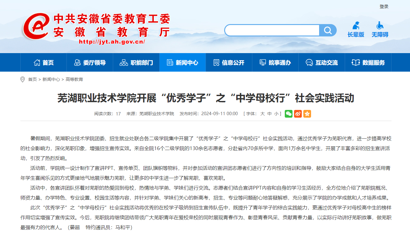 暑假期间,芜湖职业技术学院团委、招生就业处联合各二级学院集中开展了“优秀学子”之“中学母校行”社会实践活动,通过优秀学子为芜职代言,进一步提高学校的社会影响力,深化芜职印象,增强招生宣传实效。来自全院16个二级学院的130余名志愿者,分赴省内70多所中学,面向1万余名中学生,开展了丰富多彩的招生宣讲活动,引发了热烈反响。