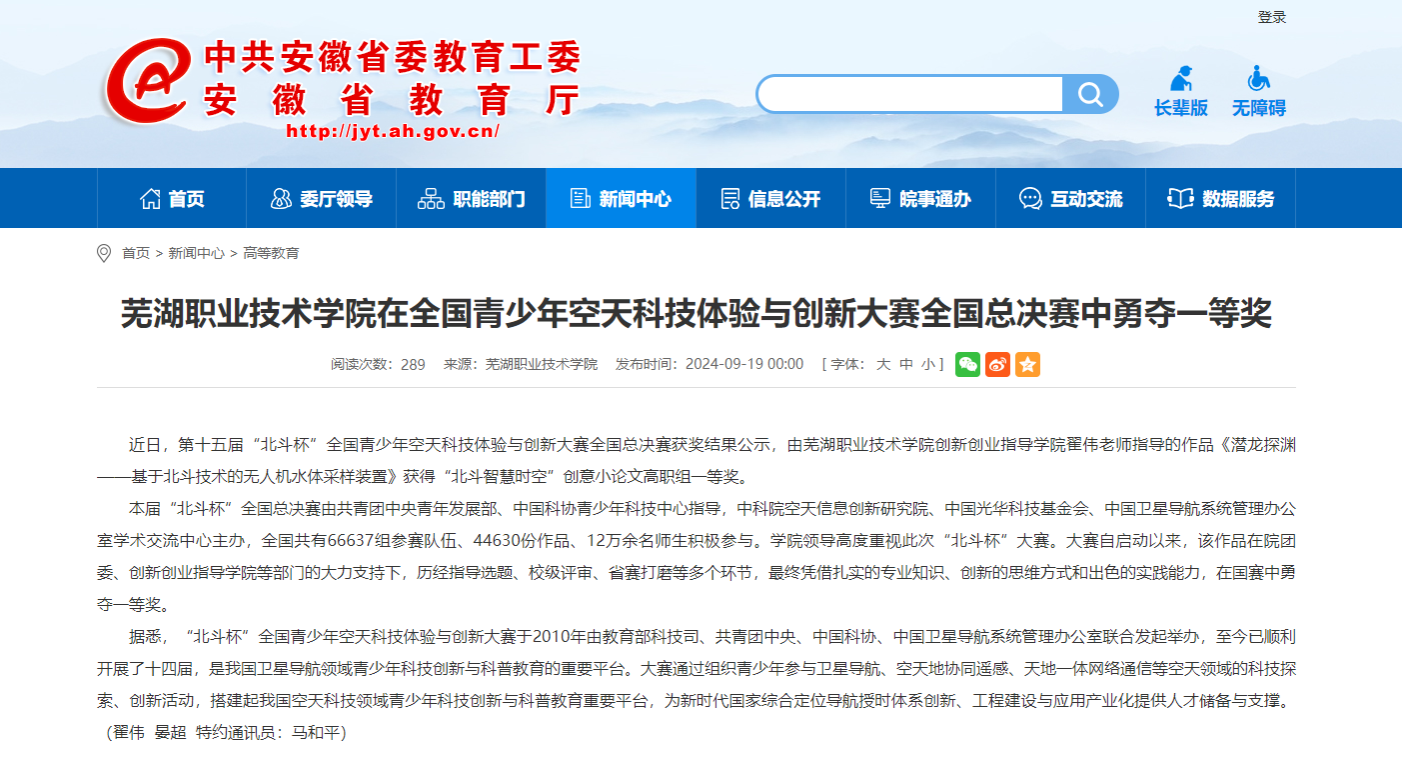 近日,第十五届“北斗杯”全国青少年空天科技体验与创新大赛全国总决赛获奖结果公示,由芜湖职业技术学院创新创业指导学院翟伟老师指导的作品《潜龙探渊——基于北斗技术的无人机水体采样装置》获得“北斗智慧时空”创意小论文高职组一等奖。