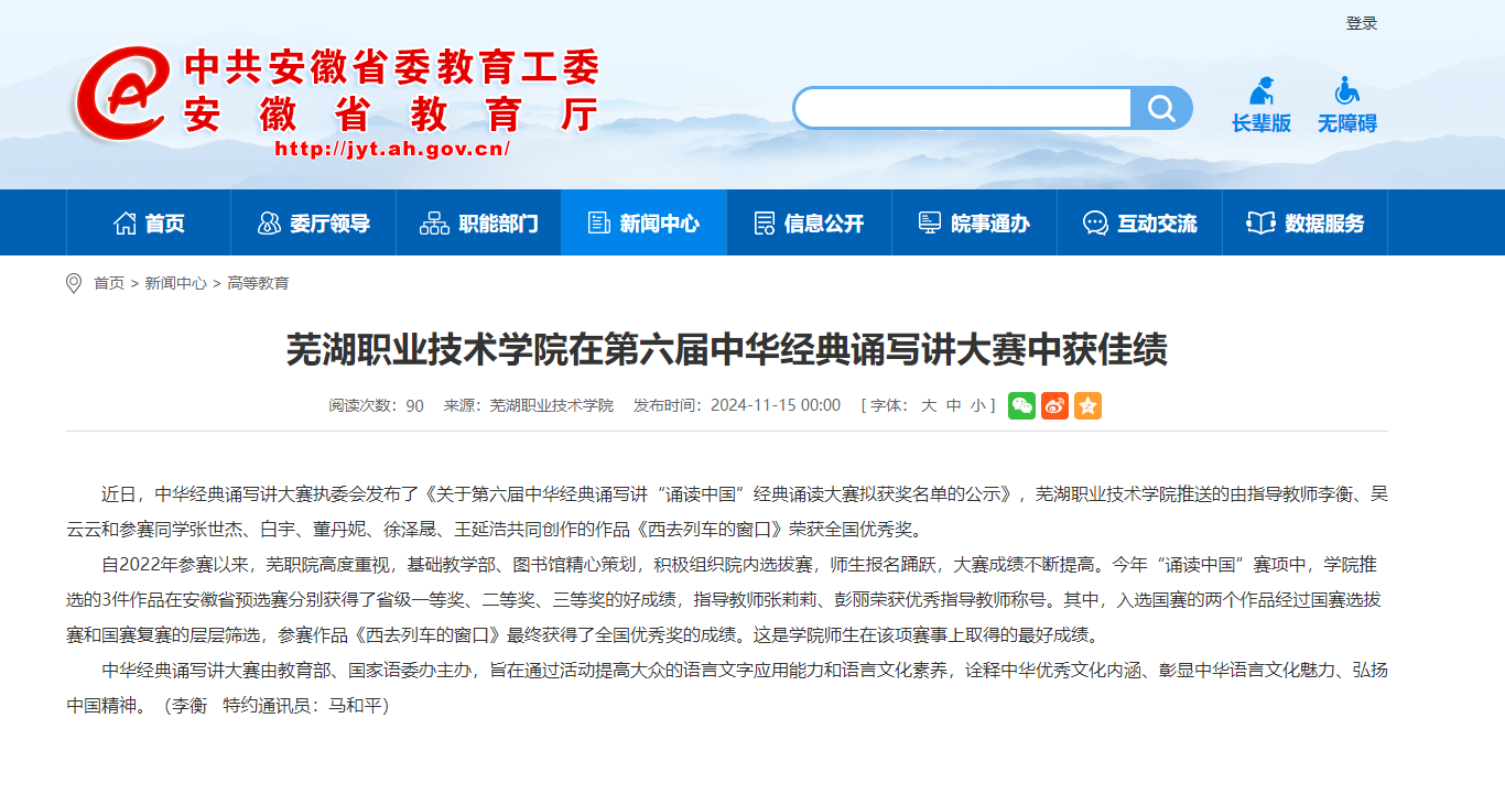 近日,中华经典诵写讲大赛执委会发布了《关于第六届中华经典诵写讲“诵读中国”经典诵读大赛拟获奖名单的公示》,芜湖职业技术学院推送的由指导教师李衡、吴云云和参赛同学张世杰、白宇、董丹妮、徐泽晟、王延浩共同创作的作品《西去列车的窗口》荣获全国优秀奖。