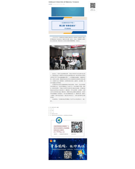 11月27日下午,芜湖职业技术学院在文津校区东一教学楼107教室召开了第三期“青春话成长”学生座谈会。党委书记王志鹏,教务处、总务处、团委等部门主要负责人与来自文津、银湖校区的12名学生代表面对面畅聊青春、共话成长。