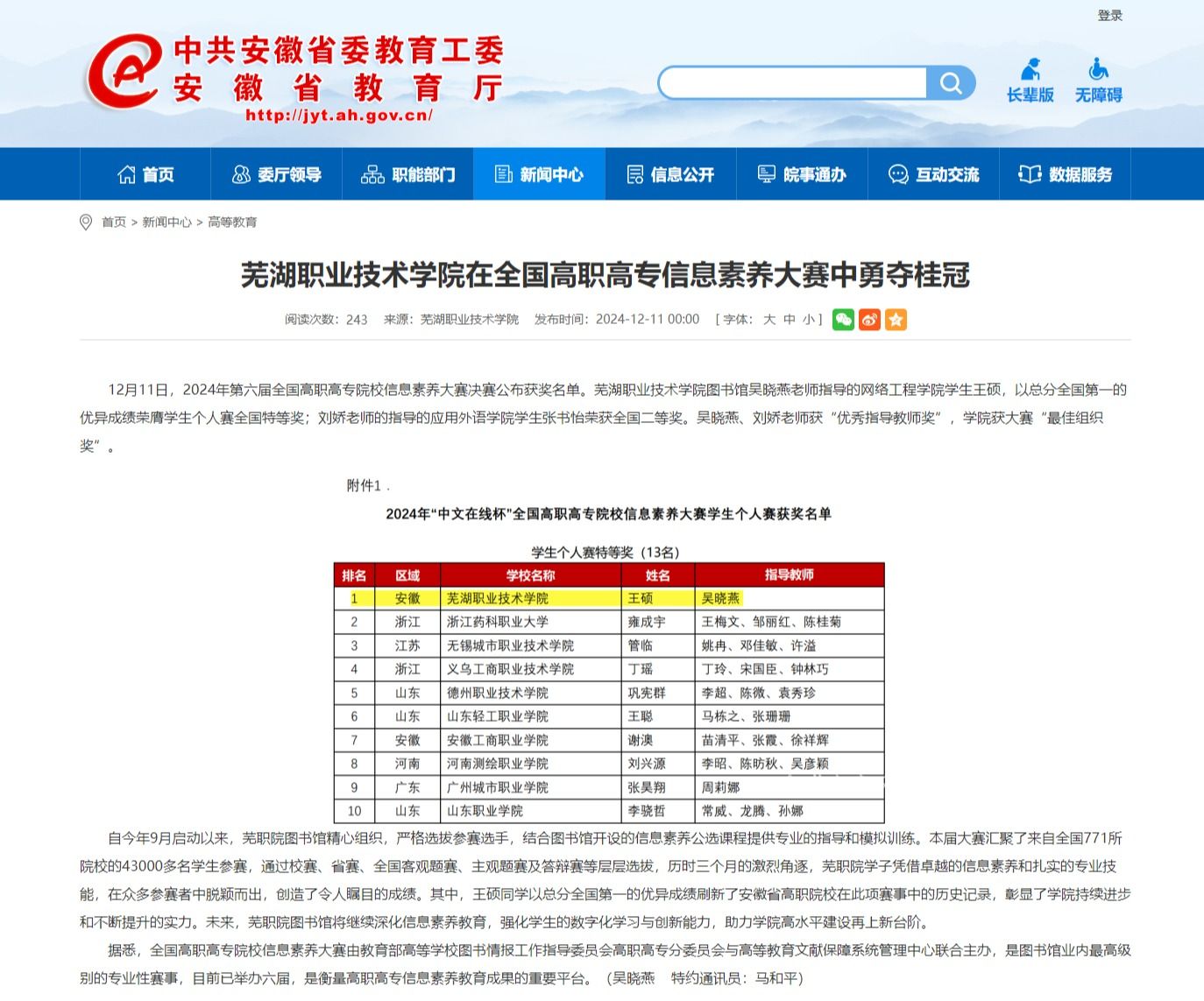 12月11日,2024年第六届全国高职高专院校信息素养大赛决赛公布获奖名单。芜湖职业技术学院图书馆吴晓燕老师指导的网络工程学院学生王硕,以总分全国第一的优异成绩荣膺学生个人赛全国特等奖;刘娇老师的指导的应用外语学院学生张书怡荣获全国二等奖。吴晓燕、刘娇老师获“优秀指导教师奖”,学院获大赛“最佳组织奖”。