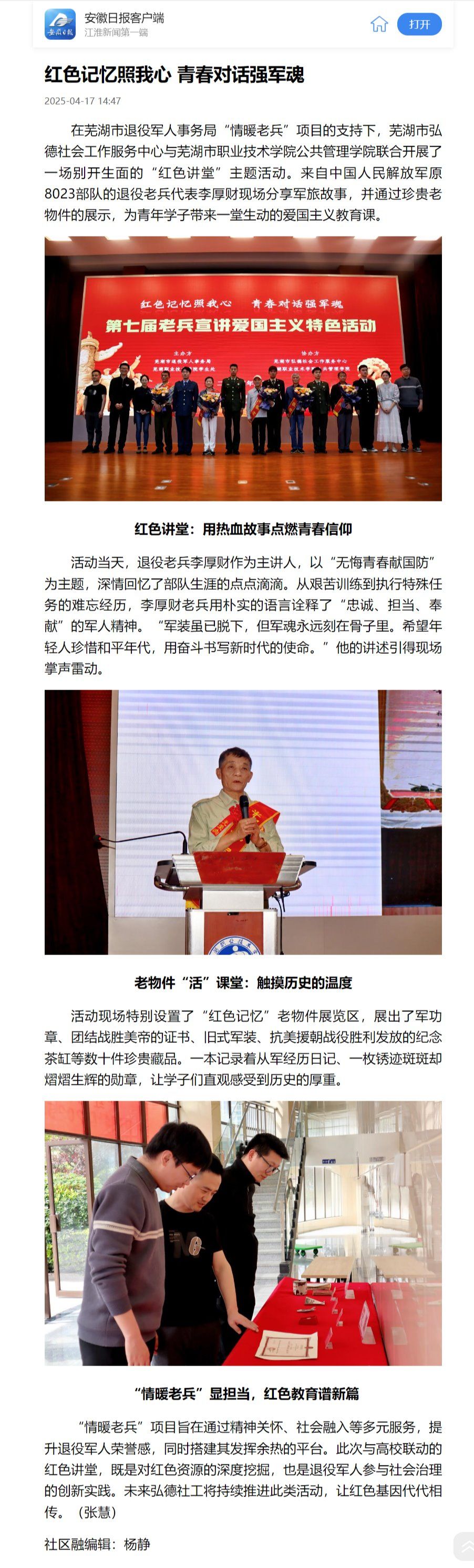 “情暖老兵”项目旨在通过精神关怀、社会融入等多元服务,提升退役军人荣誉感,同时搭建其发挥余热的平台。此次与高校联动的红色讲堂,既是对红色资源的深度挖掘,也是退役军人参与社会治理的创新实践。未来弘德社工将持续推进此类活动,让红色基因代代相传。(张慧)