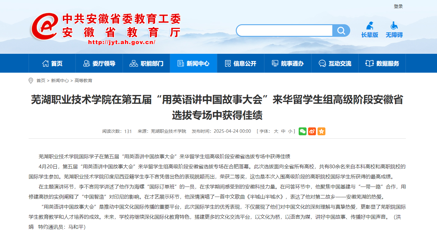 芜湖职业技术学院国际学子在第五届“用英语讲中国故事大会”来华留学生组高级阶段安徽省选拔专场中获得佳绩