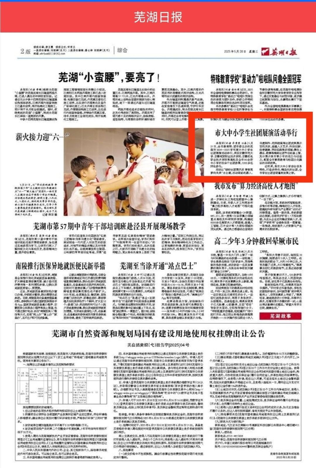 5月27日,由市教育局、团市委主办的芜湖市2024-2025学年度大中小学生社团展演活动在芜湖职业技术学院(文津校区)举行,来自安徽师范大学、安徽商贸职业技术学院、安徽机电职业技术学院等高校及全市90余所中小学的百余个社团参展,吸引近千人参与。
