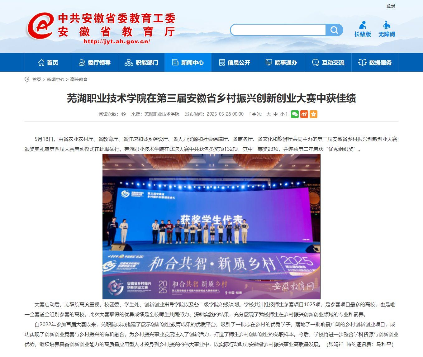 5月18日,由省农业农村厅、省教育厅、省住房和城乡建设厅、省人力资源和社会保障厅、省商务厅、省文化和旅游厅共同主办的第三届安徽省乡村振兴创新创业大赛颁奖典礼暨第四届大赛启动仪式在蚌埠举行。芜湖职业技术学院在此次大赛中共获各类奖项132项,其中一等奖23项,并连续第二年荣获“优秀组织奖”。