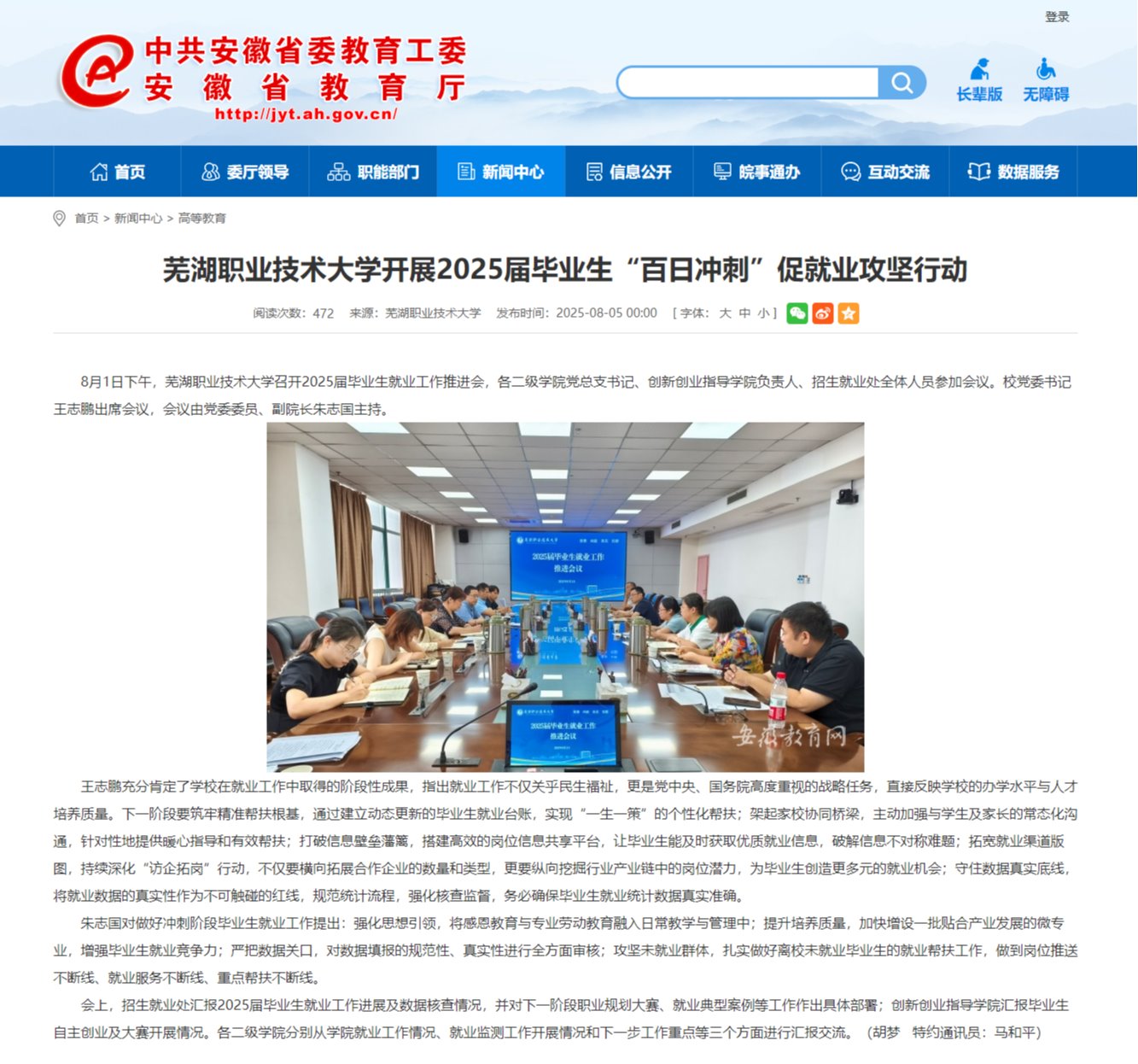 8月1日下午,芜湖职业技术大学召开2025届毕业生就业工作推进会,各二级学院党总支书记、创新创业指导学院负责人、招生就业处全体人员参加会议。校党委书记王志鹏出席会议,会议由党委委员、副院长朱志国主持。