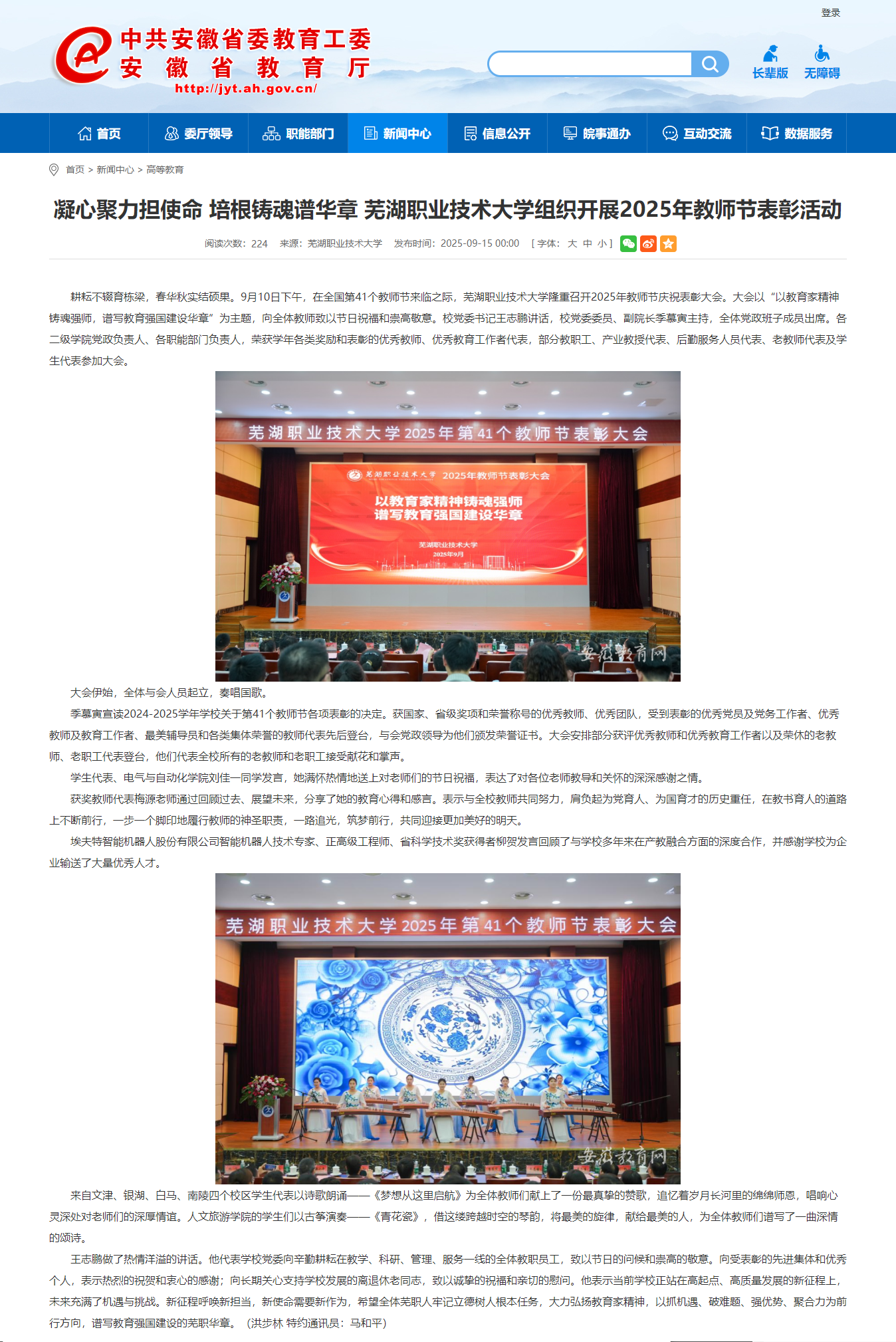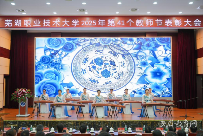 耕耘不辍育栋梁,春华秋实结硕果。9月10日下午,在全国第41个教师节来临之际,芜湖职业技术大学隆重召开2025年教师节庆祝表彰大会。大会以“以教育家精神铸魂强师,谱写教育强国建设华章”为主题,向全体教师致以节日祝福和崇高敬意。校党委书记王志鹏讲话,校党委委员、副院长季慕寅主持,全体党政班子成员出席。各二级学院党政负责人、各职能部门负责人,荣获学年各类奖励和表彰的优秀教师、优秀教育工作者代表,部分教职工、产业教授代表、后勤服务人员代表、老教师代表及学生代表参加大会。
