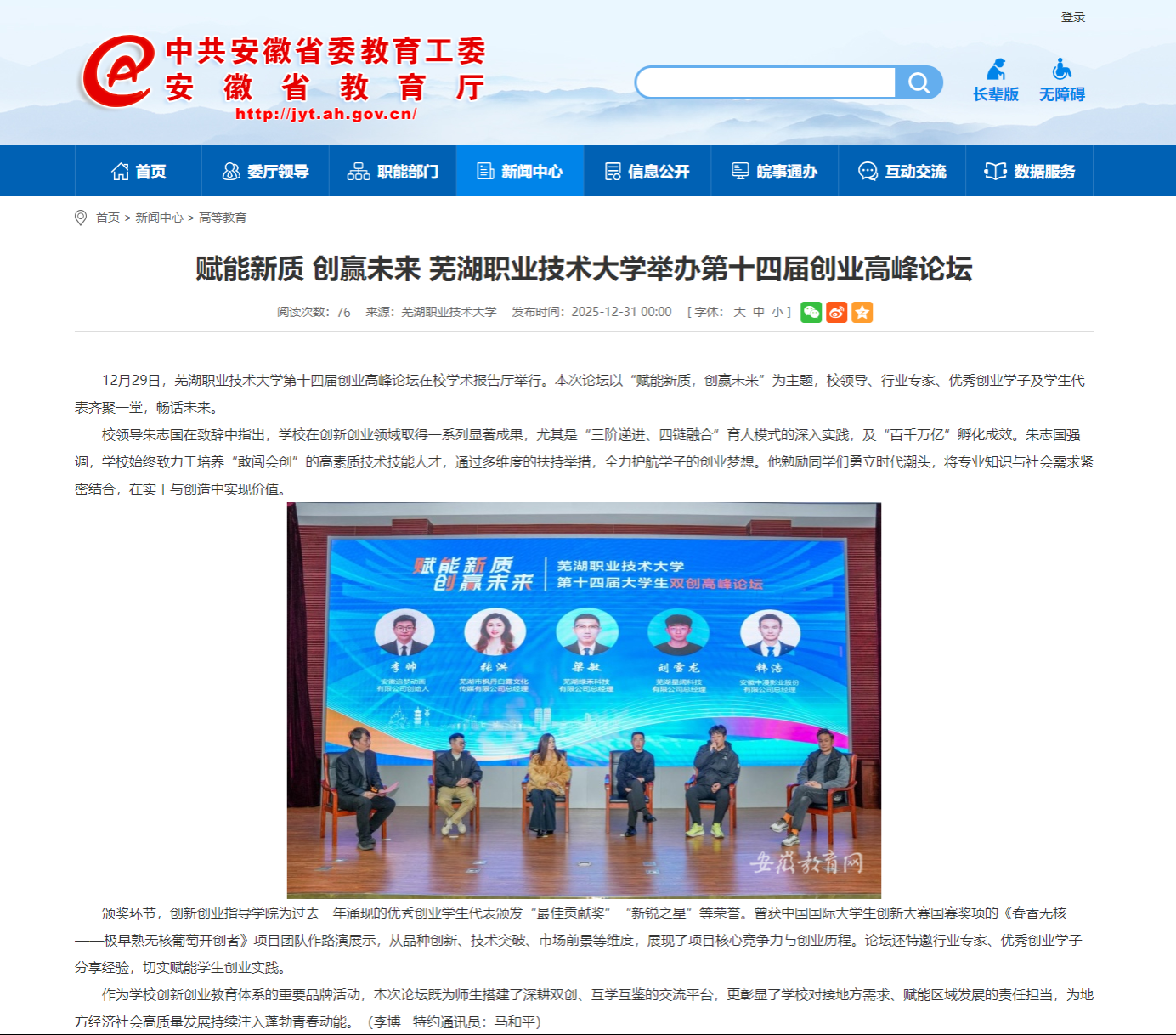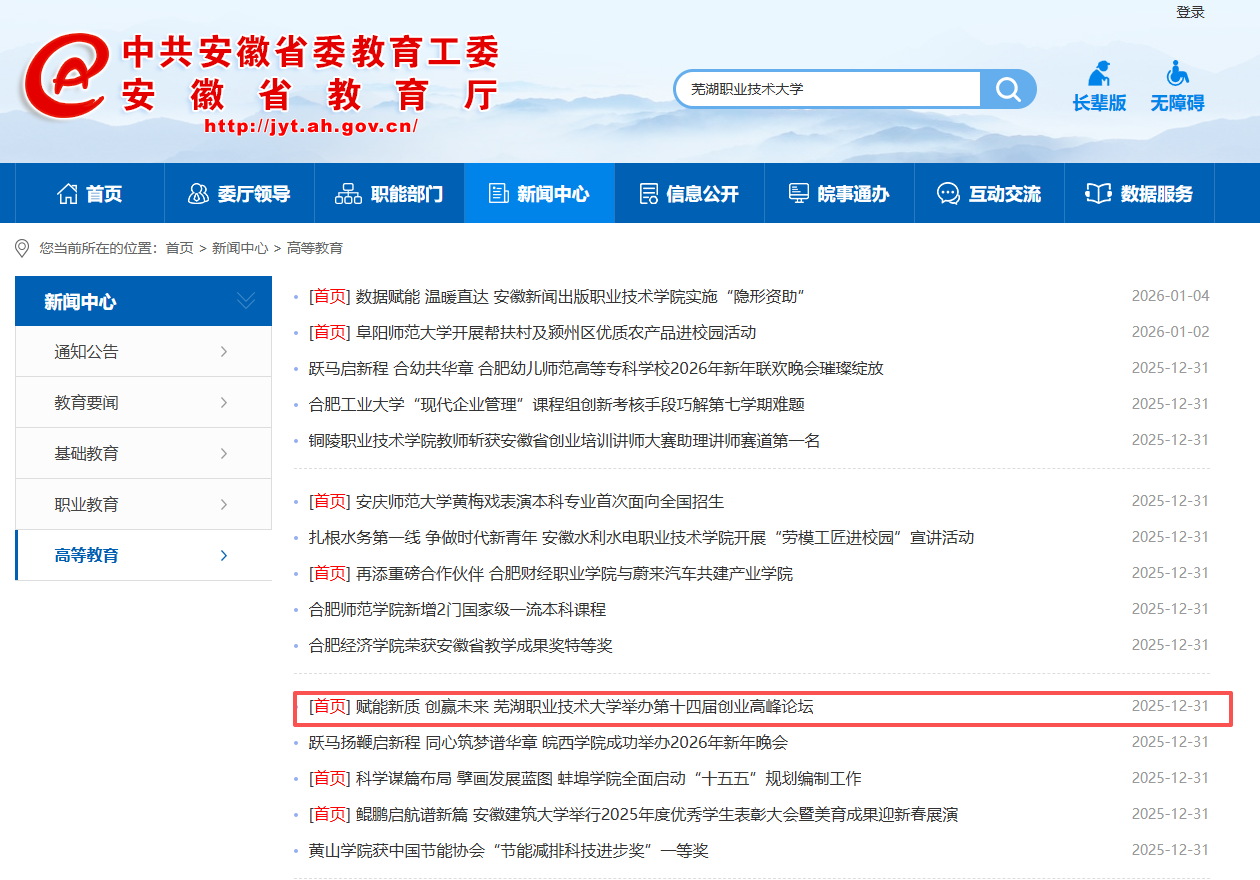 12月29日,芜湖职业技术大学第十四届创业高峰论坛在校学术报告厅举行。本次论坛以“赋能新质,创赢未来”为主题,校领导、行业专家、优秀创业学子及学生代表齐聚一堂,畅话未来。