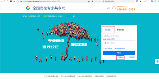 1.用户注册。登录“全国高校专家共享网”(https://zj.yuncaitong.cn/mgt/user/login?redirect=%2F),选择“专家登录”,点击下方“申请加入”。