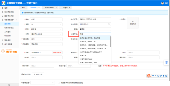 点开左侧“专家信息维护”——点击“基础信息”,完善个人信息并提交审核。“从事专业”栏目根据个人实际填写,专家在该栏目手输关键字后,根据弹出的对应专业选择确认。