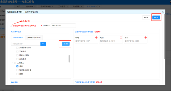 5.选择专业,完成注册。点开左侧“常用评审专业”,勾选实际从事的专业(不超过3个,超出将会被退回)——点击“添加”——点击“提交”,左上角选项卡不勾选。