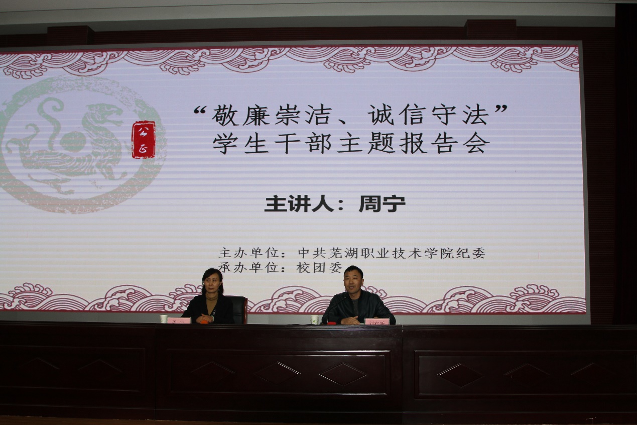 为大力弘扬新风正气,切实筑牢思想防线,营造青年学子崇廉敬廉的校园生态,11月27日下午,由校纪委主办,校团委承办的“敬廉崇洁、诚信守法”学生干部主题报告会在南校区图书馆学术报告厅举行。此次报告会邀请了经济管理学院教师、安徽深蓝律师事务所兼职律师周宁对全校200余名学生骨干进行了廉洁专题教育。会议由校团委负责人刘有新主持。