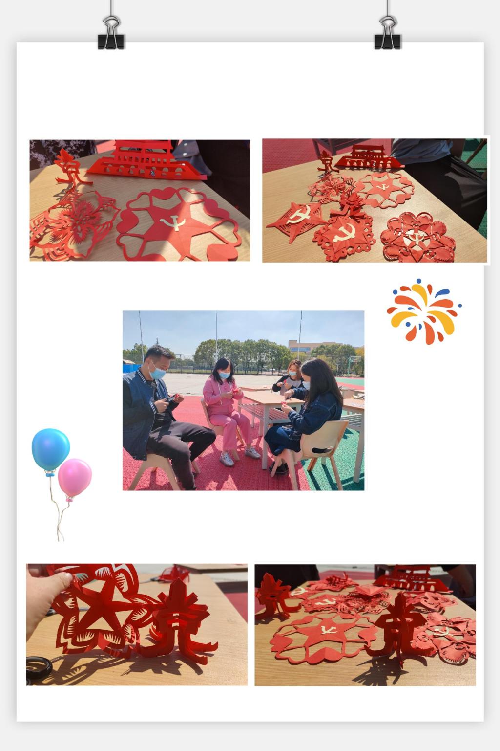 一张红纸、一把剪刀、一双巧手、一份匠心,剪出玲珑世界。活动开始前,教师和学生查阅了相关资料和教学视频,掌握了一些“折、画、剪”的小窍门。在创作过程中,时而认真思考,时而剪刀上下摆动。大家用五角星、党徽、团花等元素表达对党和国家的热爱。不一会,一张张红纸焕发出别样的风采,天安门、五角星、党旗等窗花各种各样的图案呈现出来。党总支副书记傅彧看到大家剪的党旗激动地感叹道:“我们要热爱党、拥护党,红心永远跟党在一起。”