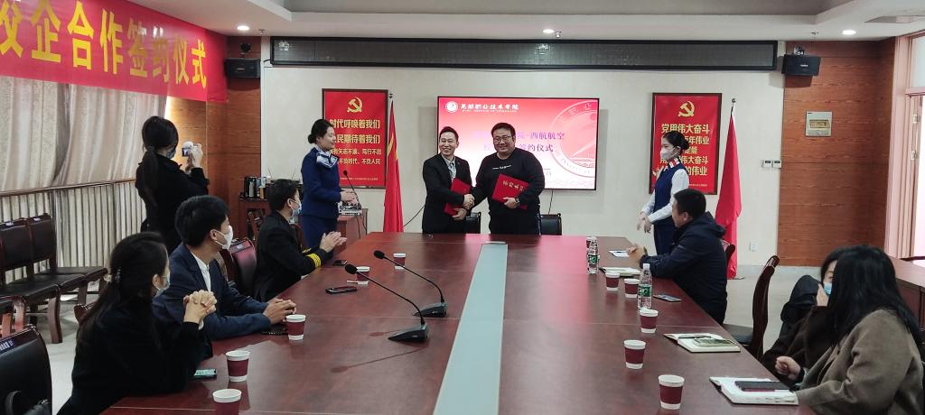 11月21日上午在明德楼1201会议室,应用外语学院与西航航空开展合作签约仪式,签署校企合作战略协议。西航航空董事长王裕正、飞安总经理金辰、西航航空外联经理江南鸽等一行人员,应用外语学院党总支书记朱力、副院长金海、党总支副书记张玲、组织委员兼学工科长钱静参加签约仪式。签约仪式由朱力主持。