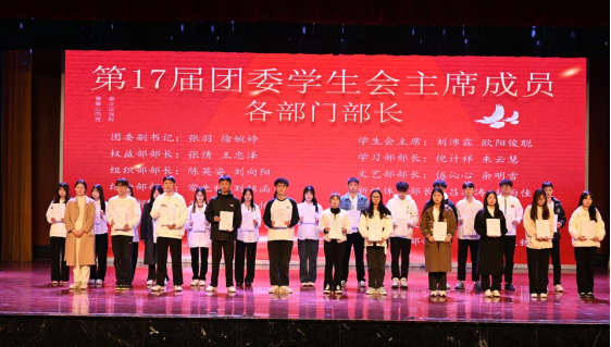 大会第二部分是第十七届团学代表大会,会上第十六届主席团代表总结任期内的各项团学工作,并对老师和同学们表示感谢,鼓励新一届团学干部坚守初心,迎难而上,为同学们做好服务。张婉春为新一届团学干部颁发聘书,新一届团学干部代表对未来的工作进行了展望,并表示新一届成员将在学院老师的关怀和指导下,迎接新挑战,创造新业绩。最后,新一届团学干部合唱一首《夜空中最亮的星》,将现场气氛推到高潮,他们将凝聚共识、鼓足干劲,以更饱满的热情、更扎实的工作、更强大的合力,推动学院团委学生会工作再上新台阶!