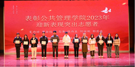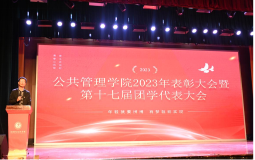 大会开始,全体起立奏唱国歌,现场气氛庄严而肃穆。大会第一部分是公共管理学院2023年表彰大会,王永琦上台致辞,对公共管理学院学生干部提出了四点希望,第一要志存高远,努力成为理想远大、信念坚定的新时代青年;第二要勤奋学习,努力成为知识广博、本领过硬的新时代青年;第三要开拓进取,努力成为善于创新、勇于创业的新时代青年;第四要修身立德,努力成为道德高尚、品行端正的新时代青年。本次表彰一共六项,分别是学院优秀志愿者、优秀新生班级助理、优秀运动员和风采展示优秀个人、第十六届团委学生会和社团先进部门及先进个人。在激情澎湃的音乐声中,学生们自信的走上舞台,小小的证书承载着沉甸甸的荣誉,是学院对他们工作的肯定,更是他们付出汗水和心血的硕果。学院大一学弟学妹们为他们献上深情朗诵《少年游》,为他们的努力付出画上圆满的句号。