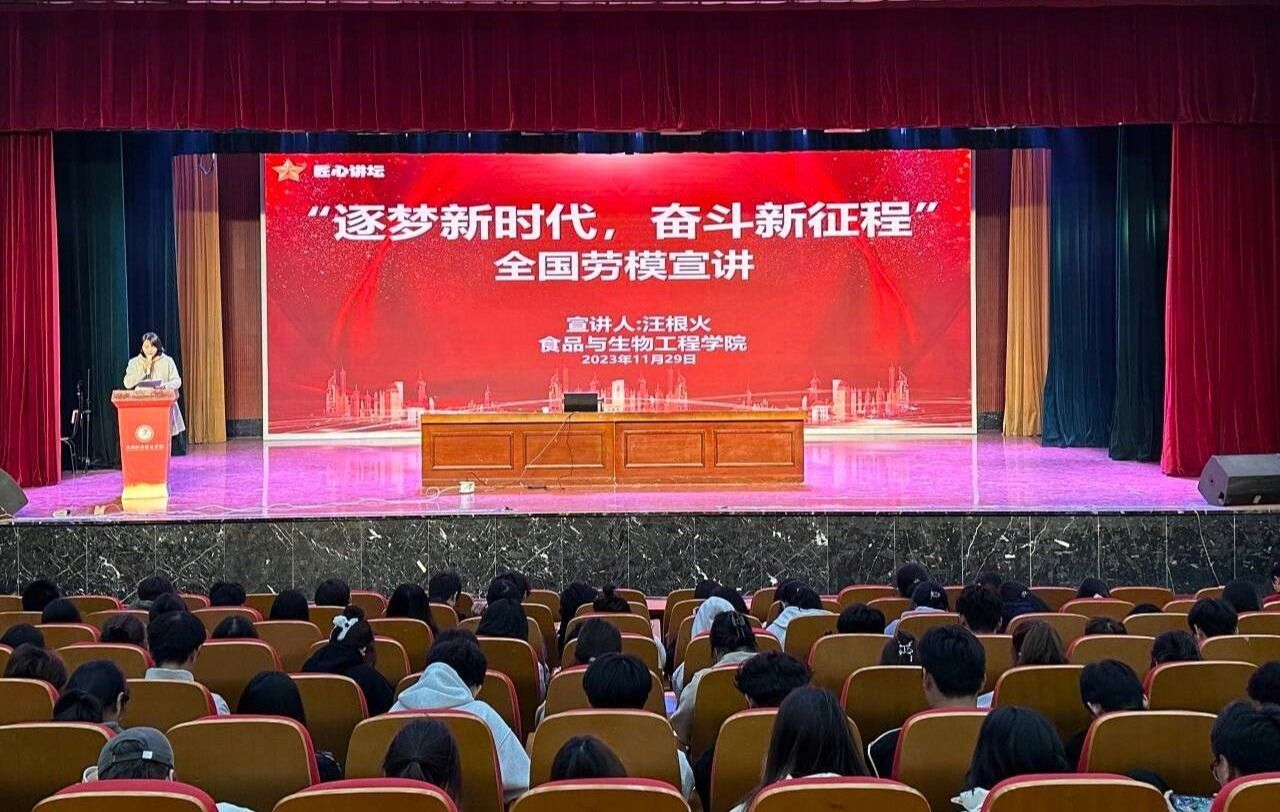 11月29日,食品与生物工程学院特邀全国劳动模范、校产业教授、“全国劳模创新工作室”汪根火先生来我校文津校区大礼堂开展“匠心讲坛”活动。学院领导班子成员、食品和药品类专业全体同学参与聆听。