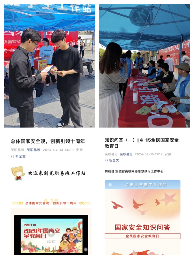 线下,以文津、银湖校区易班学生工作站为依托,通过发放宣传单页、趣味抽奖问答、横幅签名等方式,向我校学生宣传《国家安全法》《网络安全法》《保密法》等与国家安全相关的法律法规知识;线上,通过“芜职易班”微信公众号,上线2024年国家安全教育日宣传视频、国家安全法律法规条款节选,转载省高校网络思政工作中心国家安全知识问答相关内容。