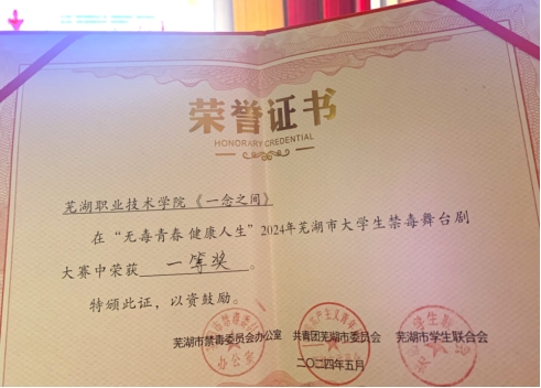 5月24日上午,“无毒青春 健康人生”2024年芜湖市大学生禁毒舞台剧大赛于安徽中医药高等专科学校举行,我校作品《一念之间》在比赛中脱颖而出,荣获一等奖并成功晋级皖南区复赛。