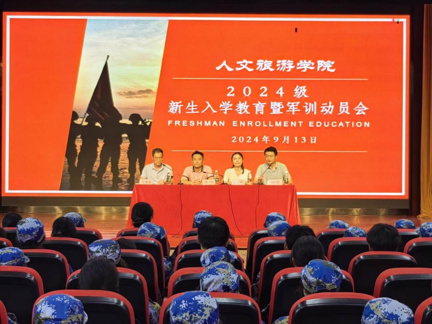 9月13日下午,人文旅游学院2024级新生入学教育暨军训动员会在银湖校区大礼堂举行。人文旅游学院2024级新生齐聚一堂,满载希冀的大学之旅由此起航。学院党总支书记孙坤、副院长孙蔚闻、副书记徐喜喜、副院长徐军,全体2024级新生及辅导员出席会议,会议由徐军主持。