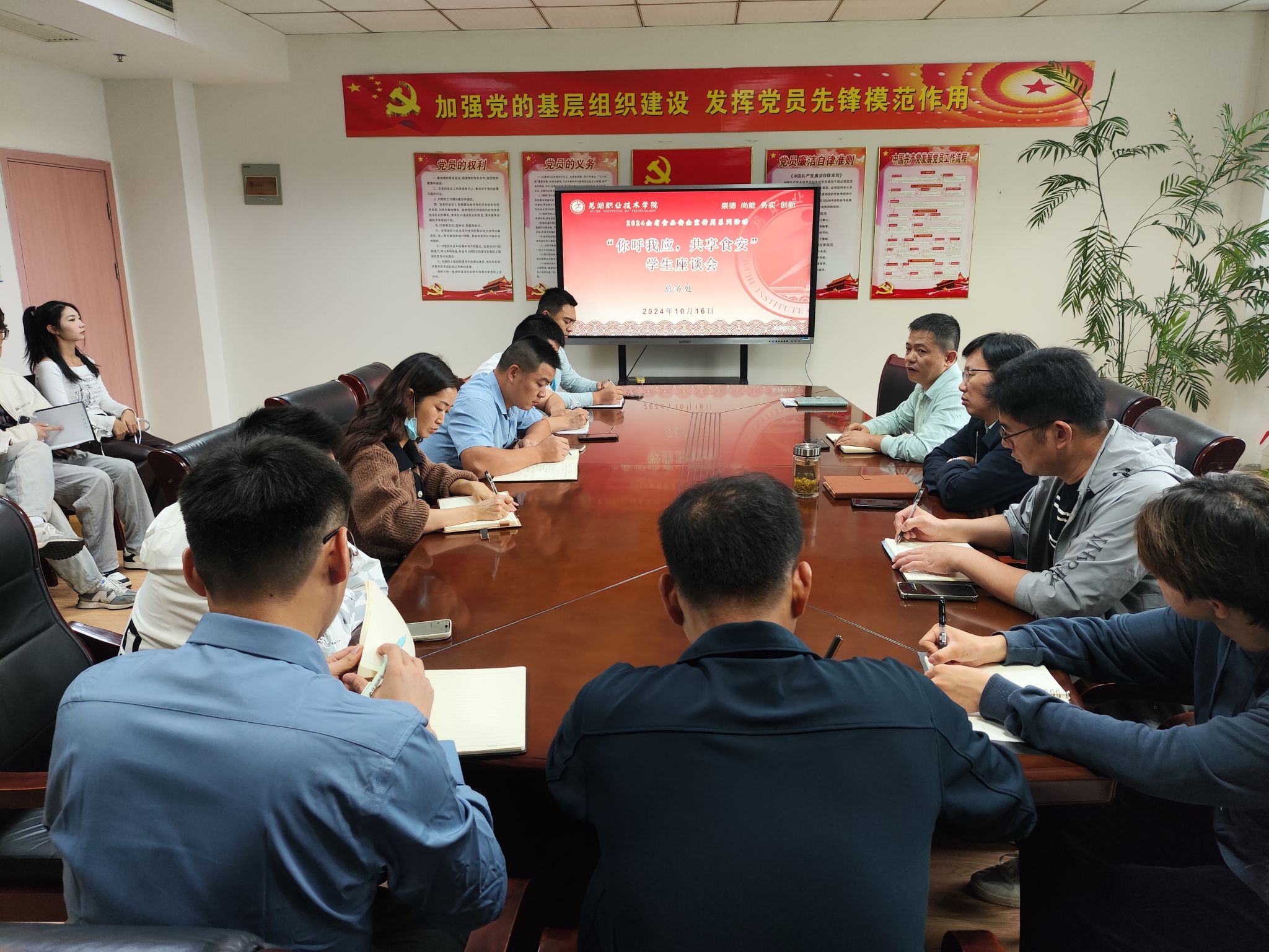10月16日下午,学校组织召开“你呼我应 共享食安”学生座谈会,深入贯彻省食安办关于开展食品安全周活动的通知精神,进一步增强广大学生安全意识,推进校园食品安全与服务质量提升。文津、银湖校区座谈会分别由总务处处长孙万根、银湖校区管委会副主任李周明主持,总务处相关人员、食堂项目经理和各学院学生代表参加了会议。