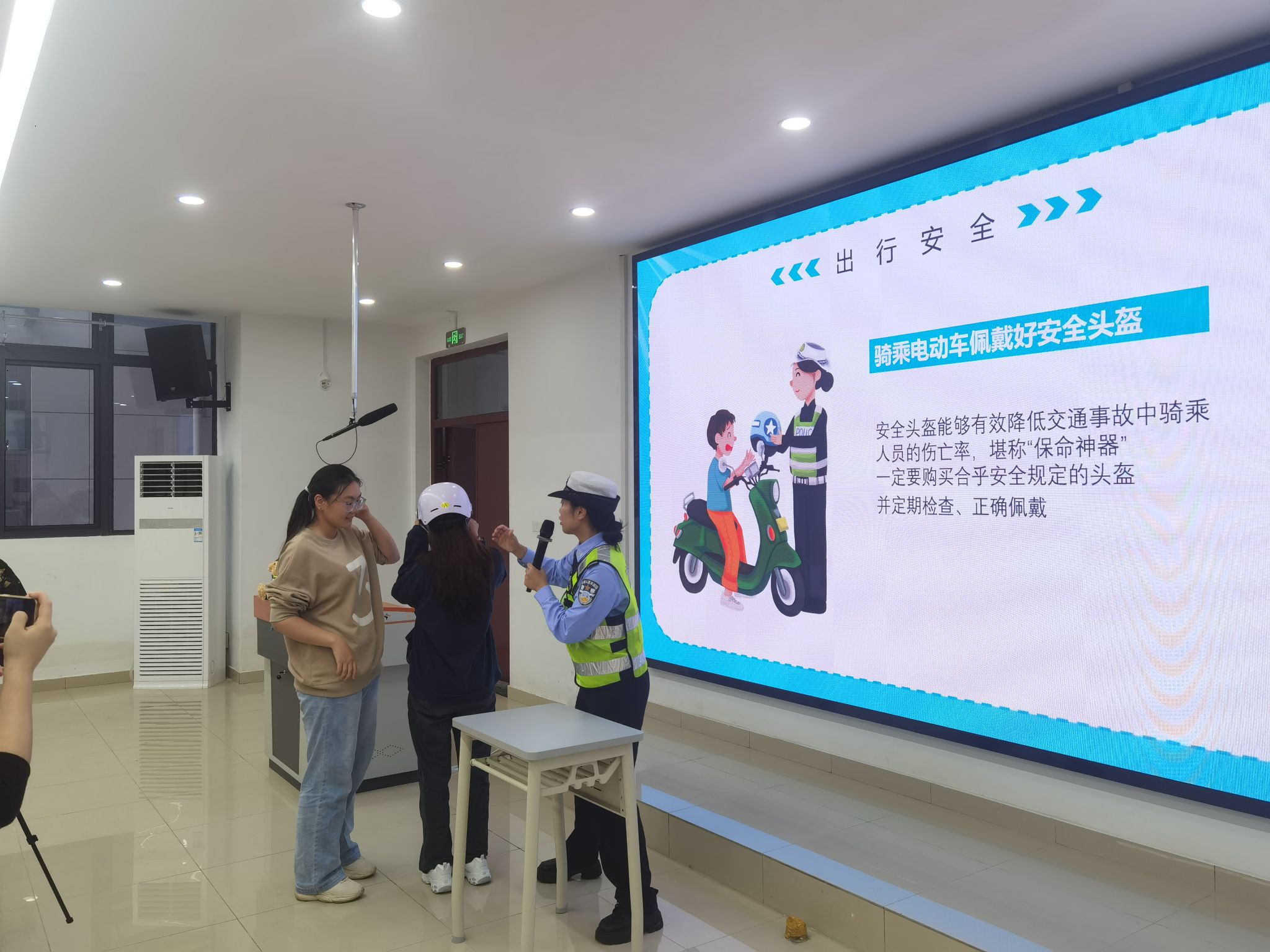 紧接着,宣讲民警通过生动有趣的讲解、各类互动问答、现场实验等多种形式,向学生们普及了各种交通安全知识。详细讲解了头盔在交通事故中的保护作用,以及不佩戴头盔的严重后果;结合校园周边交通环境和学生的出行特点,分析了常见的交通安全隐患,提醒学生们在上下学途中要遵守交通规则,注意交通安全。