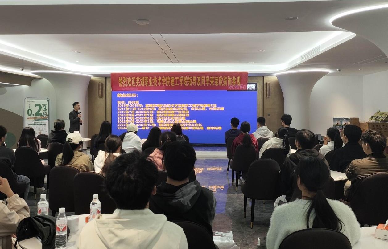 在芜湖荣欣美家,毕业生们受到了公司负责人的热情接待。随后公司负责人详细介绍了公司的发展历程、岗位介绍以及最新的发展动态,并带领学生先后参观了公司的实景样板间、家居装修产品,直观感受家居装饰的设计理念。此外,企业还特别安排了校友分享环节,学院18届毕业生孙兆贤作为荣欣美家的职员,结合自身的职业发展经历与同学们进行了分享与交流。