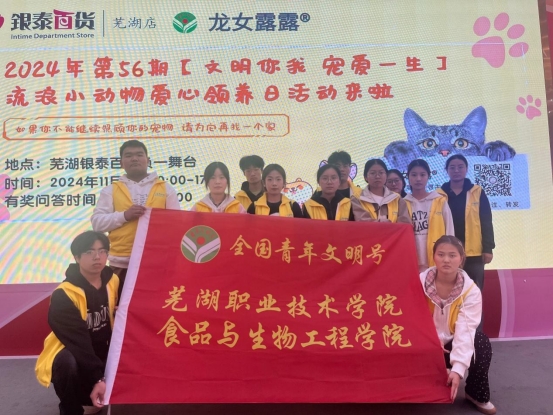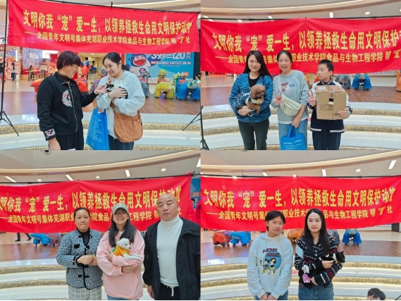 11月16日,全国青年文明号--芜湖职业技术学院食品与生物工程学院率领大学生社团“明宠社”在弋江区银泰百货开展了第56期“文明你我,宠爱一生”大型公益领养活动。本次活动旨在帮助市民们进一步了解文明养宠知识,为流浪动物提供更多的关爱和保护。