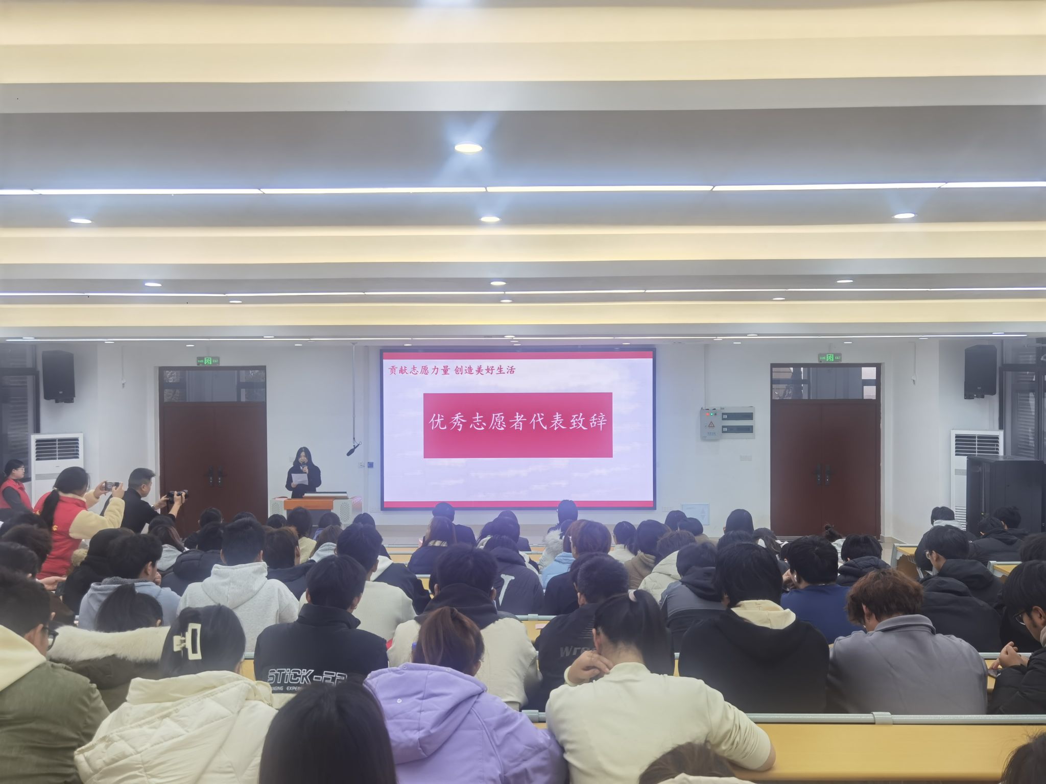 随后,家发镇党委委员张鹤作讲话,他对学校长期以来对地方志愿服务工作的支持表示感谢,并介绍了家发镇丰富的红色资源和志愿服务项目,期待通过此次活动,能够吸引更多青年学子加入到红色志愿服务的行列中,共同守护和传承红色文化。优秀志愿者代表周懿上台分享了自己的志愿服务经历,深情讲述了在志愿活动中遇到的感动与挑战,以及如何在服务中成长,如何通过自己的努力为社区带来改变。这份真挚的分享,如同一粒种子,播撒在每位同学心中,激发了他们参与志愿服务的热情。
