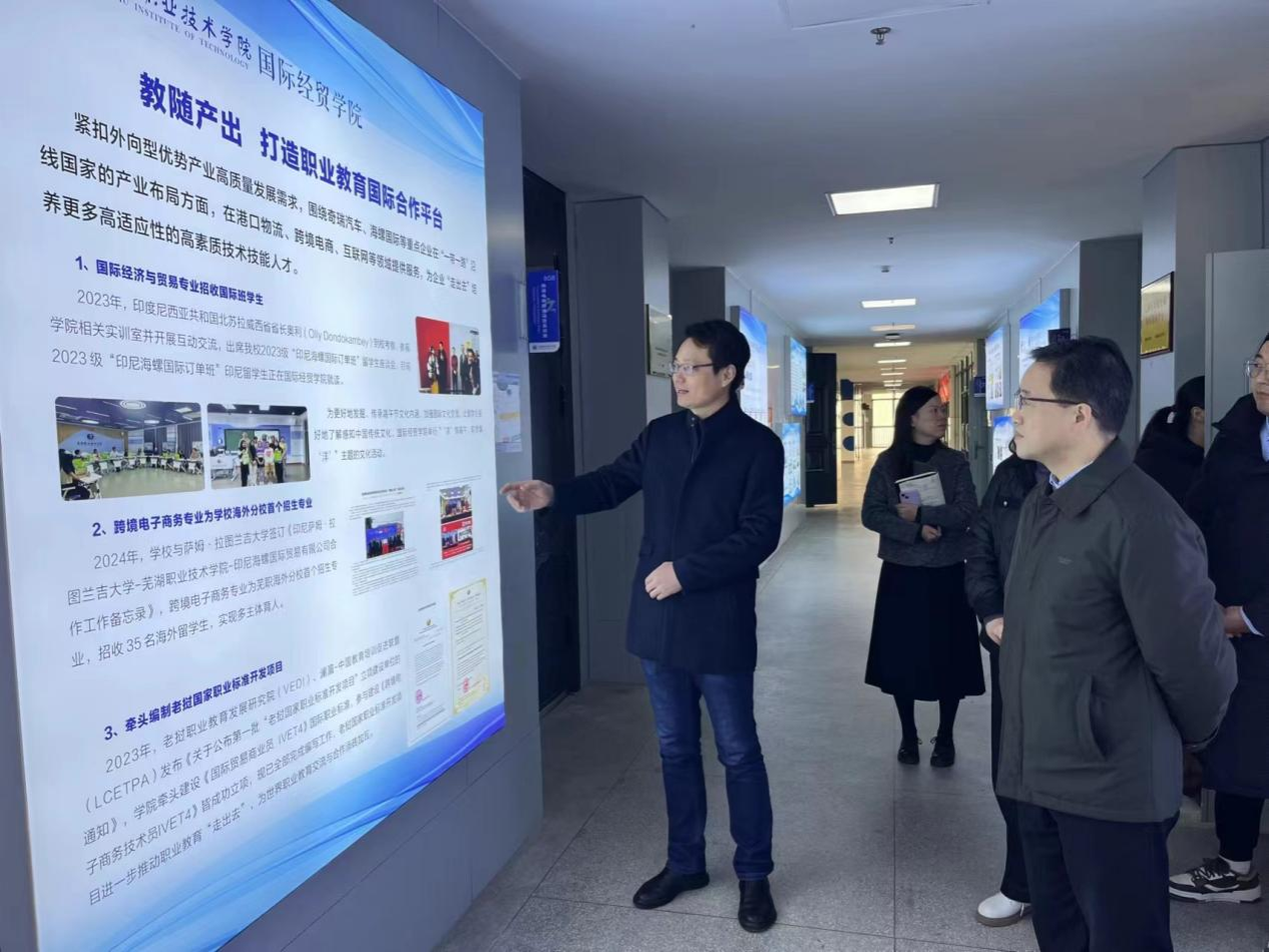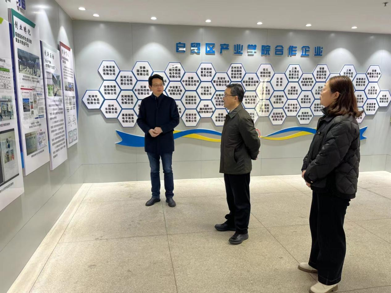 王志鹏首先参观港口物流实训基地、自贸区产业学院、跨境电商直播实训室等,并观摩了创业小组师生的现场直播。随后座谈会上,王志鹏听取了国际经贸学院专业建设、产教融合、技能大赛、学生工作、师资建设等情况汇报,对学院集中力量做精做强专业,专注于多层次、多主体办学的发展思路和取得的成绩给予了充分肯定。王志鹏就推动学院进一步高质量发展提出了要求:一要持续强化政治引领,以高水平党建为学院发展提供坚实政治保障,实现学院各项事业发展与党建的深度融合;二要立足现代服务业,瞄准长三角一体化发展,聚焦专业建设,探索文科工科交叉交融新模式;三要持续深化校企合作,以联合体、共同体建设为抓手,不断创新合作模式,驱动高质量就业新引擎,助推区域经济社会高质量发展;四要牢固守住校园安全底线,学院领导班子要担起校园安全责任,凝聚多方力量,共筑育人共同体,着力提升学生学业能力、心理健康、综合素养培养等一系列工作成效。