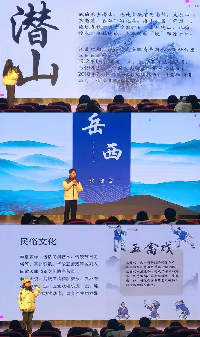 参赛学生通过PPT演讲和播放视频相结合的方式,全方位展示了自己家乡的风土人情、历史文化、自然景色和特色美食,表达了对家乡的热爱与自豪。从安逸平静的乡间小镇到华灯璀璨的都市景观,从钟灵毓秀的古韵徽州到曲艺道情的皖北民俗,借助选手们精彩纷呈的讲解和包含家乡文化的才艺展示,让在场观众感受到锦绣华夏的如诗如画和中国文脉的博大精深。评委们从专业性、创意性、表现力等多个角度进行综合评价,当场决出一、二、三等奖,并对优秀选手进行表彰。
