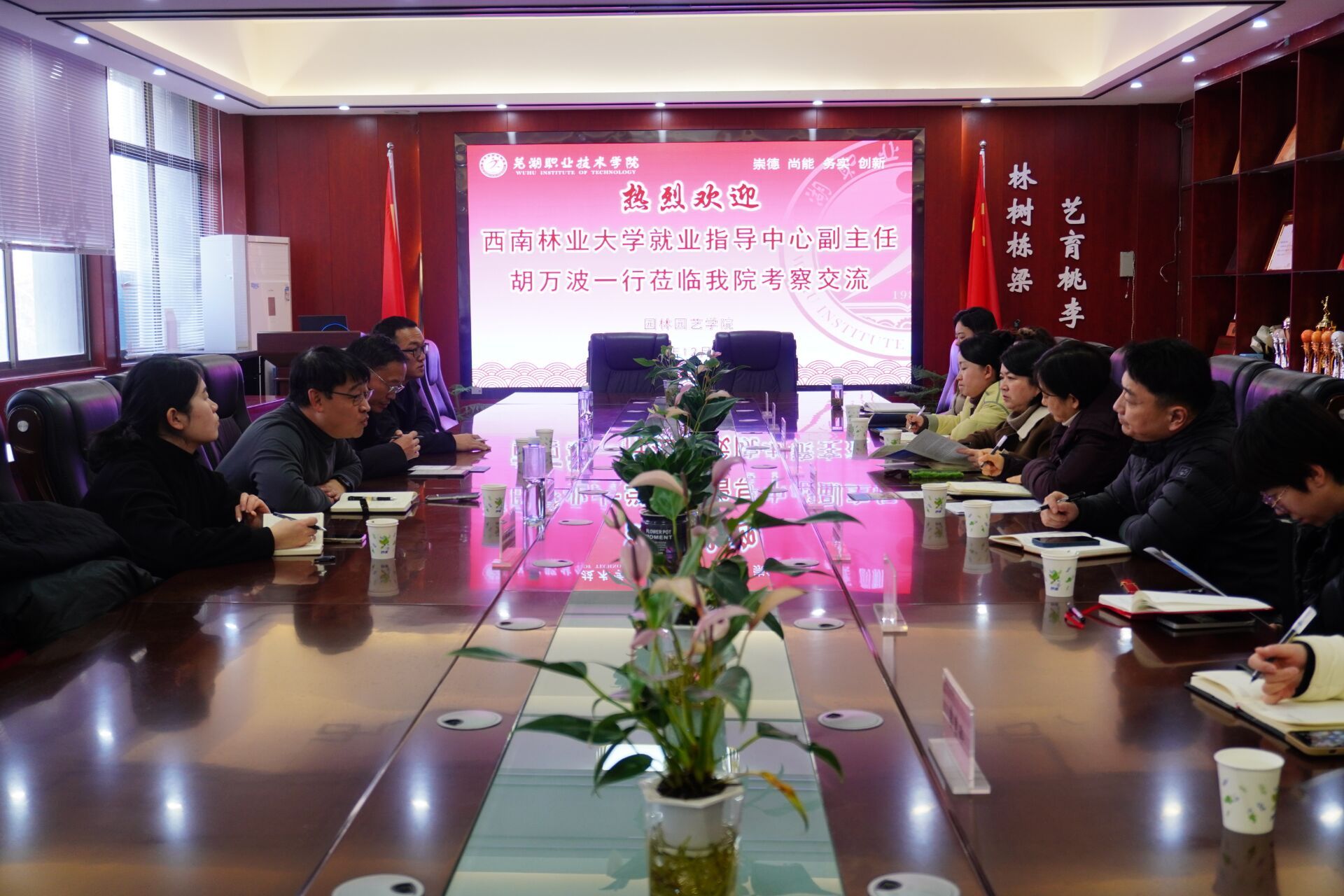 12月25日下午,西南林业大学就业指导中心副主任胡万波一行4人到园林园艺学院考察交流,园林园艺学院党政班子、骨干教师和部分辅导员参加座谈交流。