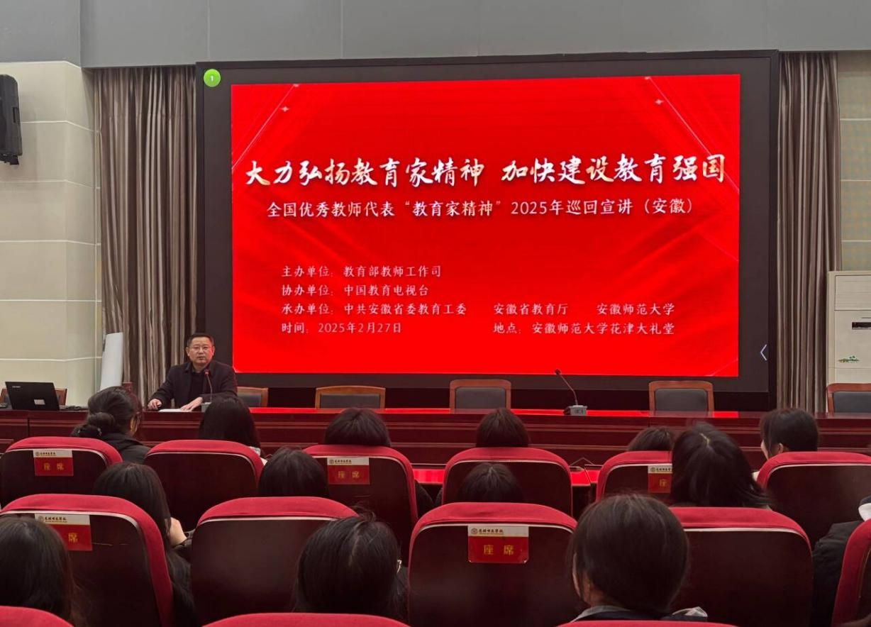 2月27日下午,根据安徽省教育厅及学校统一安排,职师院组织无授课任务的教师、行政人员和学前教育专业学生代表,在德正楼一楼报告厅集中观看“教育家精神2025年巡回宣讲”。