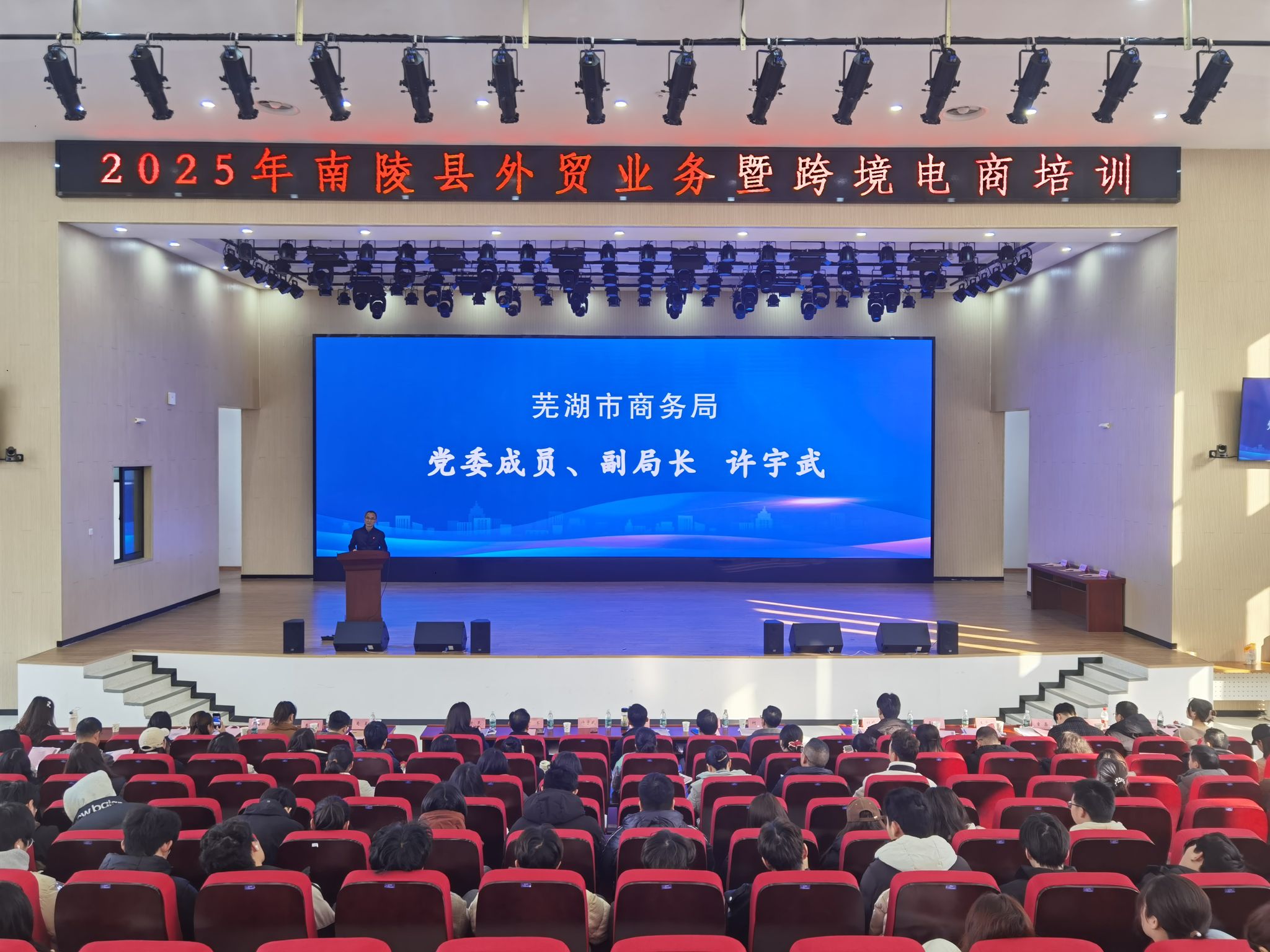 培训活动在芜湖市商务局党委委员、副局长许宇武的开班致辞中正式启动。许宇武在致辞中强调了跨境电商等新业态新模式蓬勃发展对促进全市经济发展的重要性,并肯定了南陵县在外贸和跨境电商领域所取得的显著成绩。同时,他对参加此次培训的学员提出了殷切期望,希望他们能够珍惜此次学习机会,深入思考,积极交流,做到学有所获、学以致用。