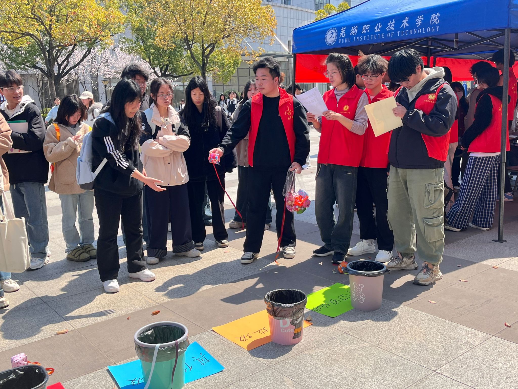 在活动现场的“垃圾分类丢沙包”游戏区,同学们化身“环保投手”,将印有废弃物品图案的沙包投入对应的“厨余垃圾”“可回收物”“有害垃圾”“其他垃圾”4个分类箱中。活动融入竞技元素,参与者需在30秒内完成5次精准投放,挑战成功者可兑换奖品。