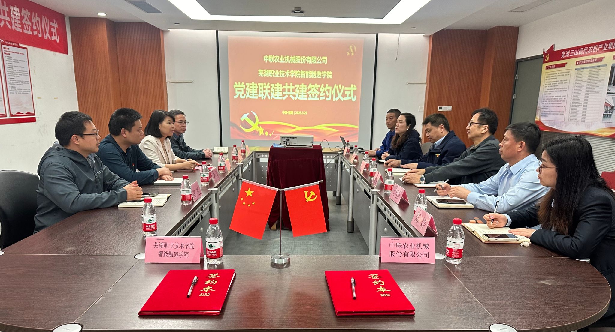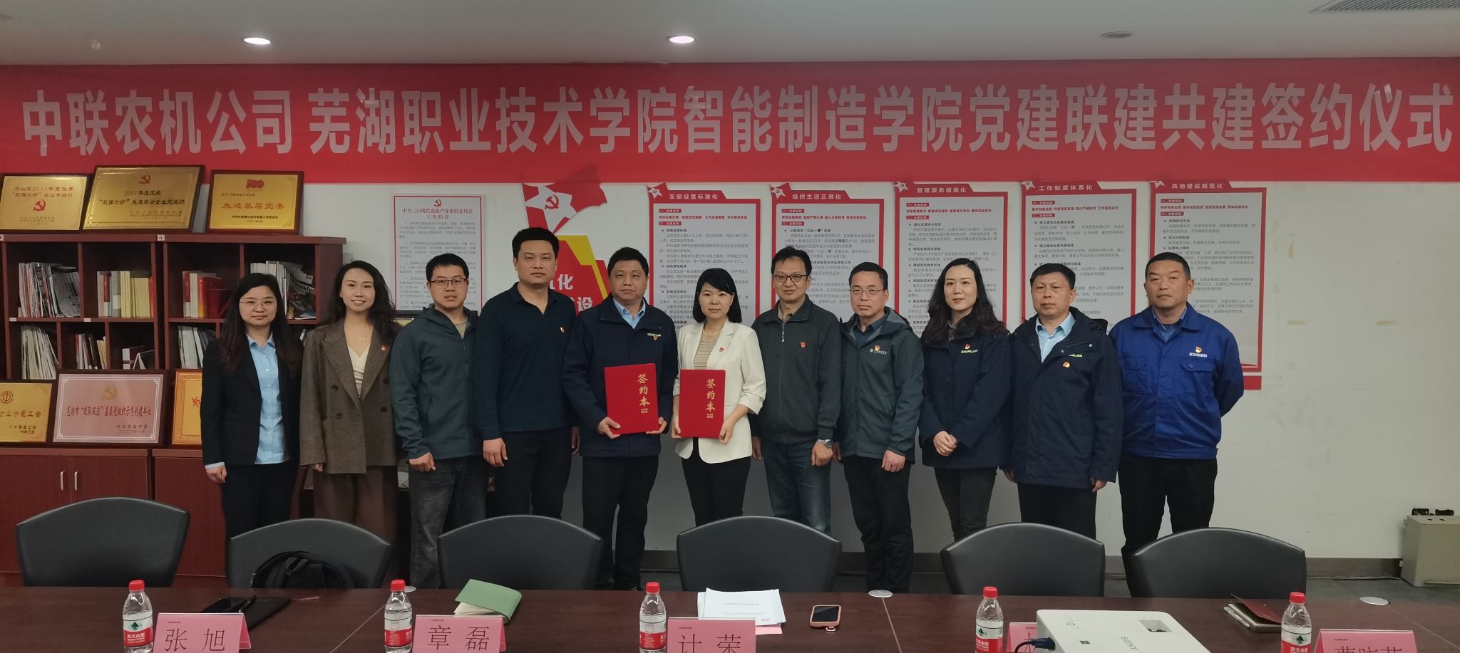 3月27日下午,智能制造学院党总支与中联农机股份有限公司党委举行党建共建签约活动。中联农机公司党委副书记胡显清、工会副主席缪璇,芜湖事业部工艺部副经理马廷友,智能制造学院党总支书记计荣、副书记林宗良、总支组织委员曹晓芹、数控技术专业负责人张旭,三山经济开发区园区企业党委副书记、经济发展局副局长章磊等共同参加活动。