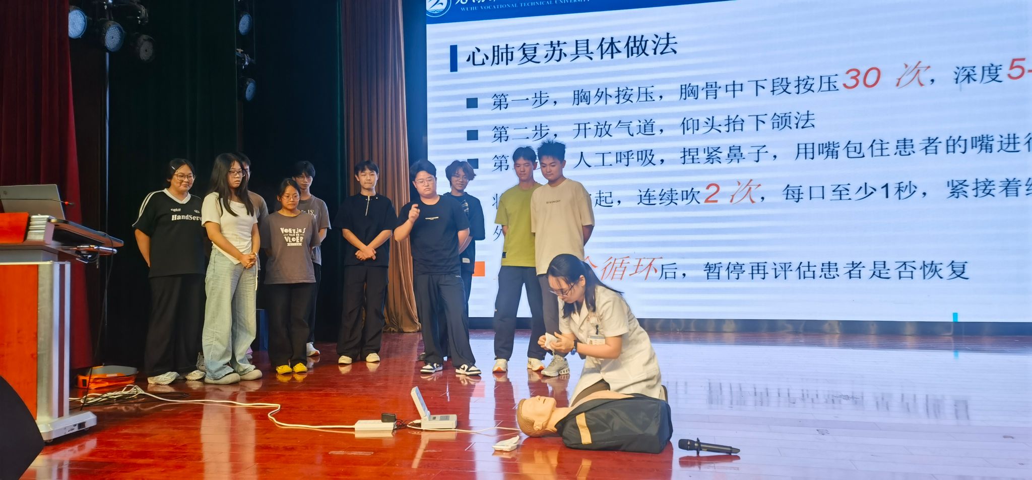 开学典礼结束后,保卫处副处长彭伟松给全体25级本专科新生开展了安全教育专题讲座,进一步增强了新生的安全意识与防范能力,切实使安全教育入脑入心。校总务处丁楚涵老师为全体新生带来了一场实用而生动的急救培训。