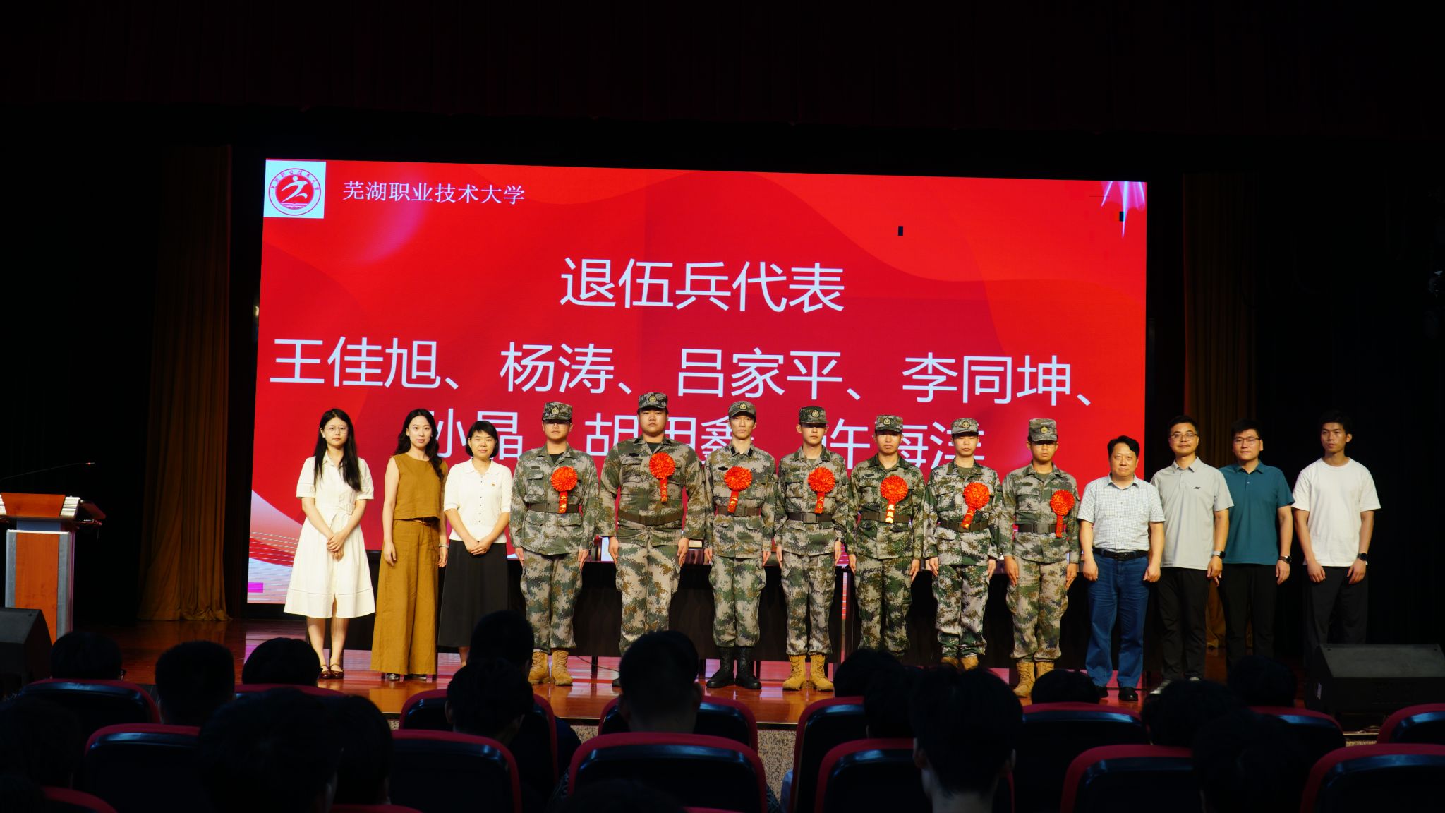 随后,学院特别为退伍复学大学生举行了欢迎仪式。多名光荣退役、重返校园的学子整齐入场,学院领导为他们佩戴大红花,致敬他们携笔从戎、保家卫国的青春选择,并欢迎他们重返校园,继续书写人生新篇章。