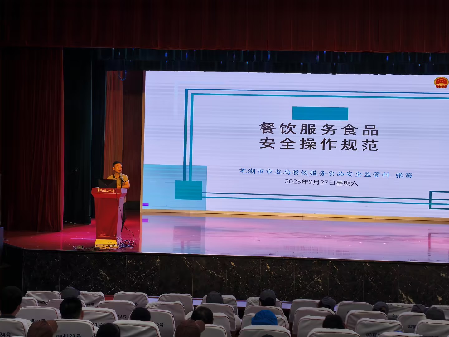 9月27日下午,学校特邀芜湖市市场监督管理局餐饮服务安全监督管理科科长张笛,开展《餐饮服务食品安全操作规范》专题解读培训。总务处工作人员、驻校第三方监管服务单位全体人员、学校各校区食堂从业人员共计200余人参加此次培训会。