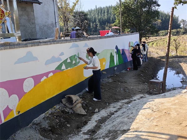 绘制过程中,志愿者们分工明确、有条不紊、齐心协力,从起形到上色、再到精修,从最初粉笔在墙面上勾勒出轮廓,到整体图案栩栩如生呈现在墙面,每一个步骤都力求精益求精,他们满怀热情的辛勤创作让原本单调的墙面焕发出全新的艺术生命力。村民也在现场驻足观看,频频点赞。同学们还主动邀请村民参与绘制,极大地提升了村民的参与感与获得感。