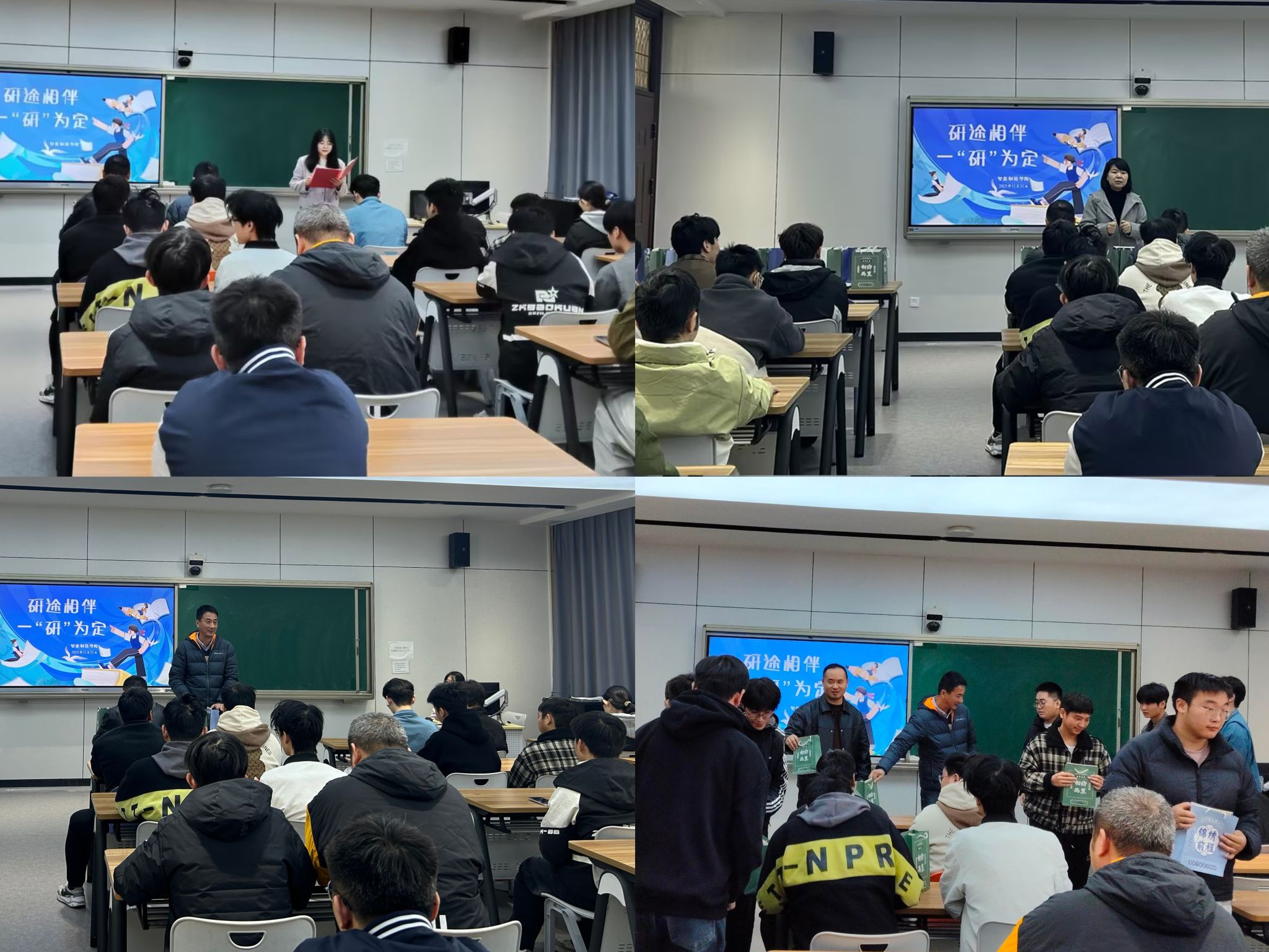 11月21日中午,智能制造学院在惟实楼新多九教室举办了以“研途相伴,一‘研’为定”为主题的考研慰问活动。学院党总支书记计荣、副院长朱强,辅导员王慧、杨亚、徐丽茹以及2026届考研学生参与此次活动,活动由王慧主持。