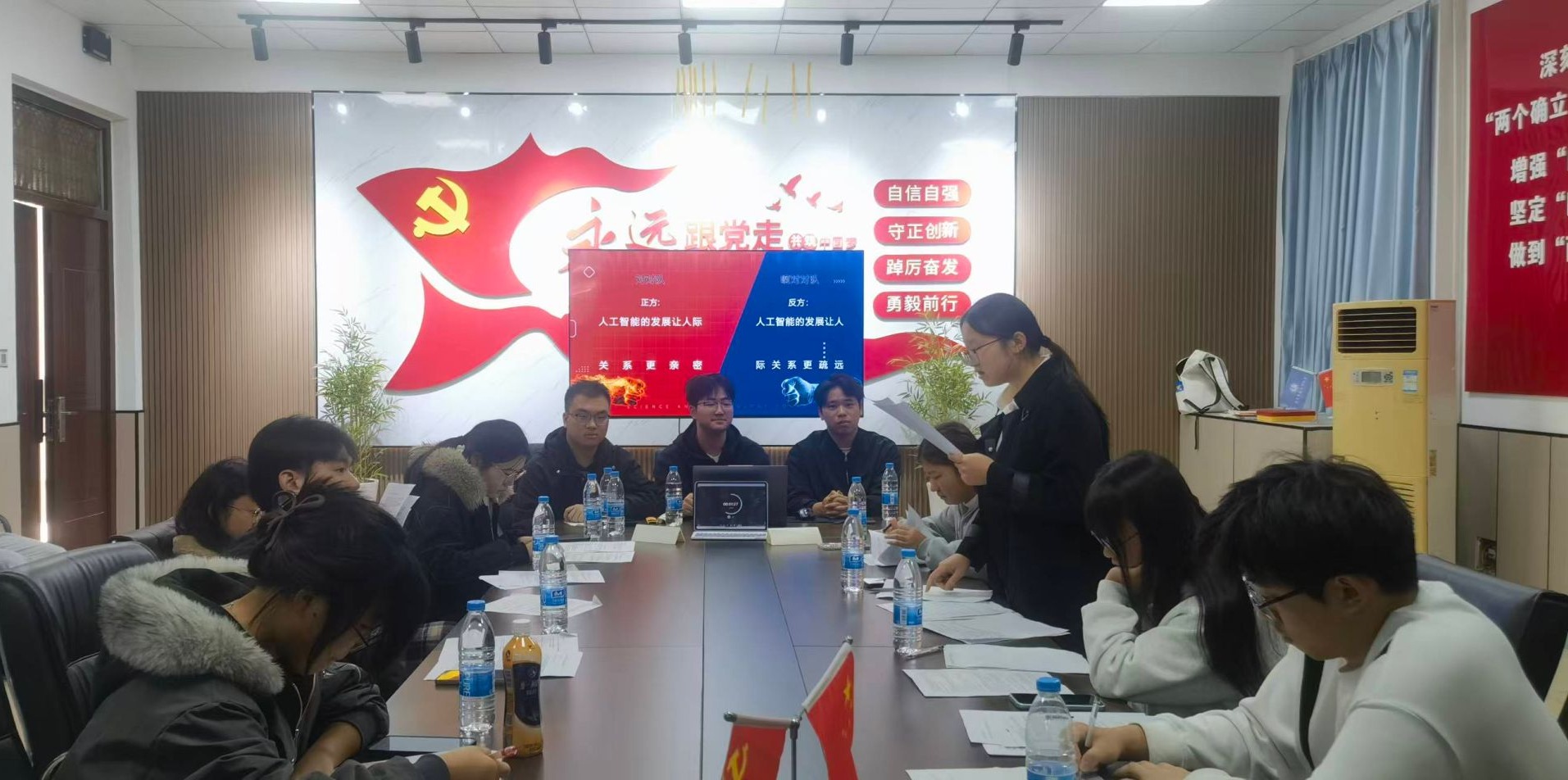 辩论赛中,各组选手依次围绕“人工智能的发展让人际关系更亲密还是更疏远”“逆境是否更有利于人的成长”及“大学期间专业能力与综合素质哪个更为重要”三个议题展开激辩。比赛伊始,双方辩手先作简要自我介绍,随即进入开篇立论环节。正方立足清晰的逻辑架构层层推进,系统阐述己方立场;反方亦不甘示弱,迅速找准切入点予以有力回击。你来我往之间,辩手们敏锐捕捉对方论证中的薄弱之处,展现了出色的应变能力与协同作战的精神风貌。