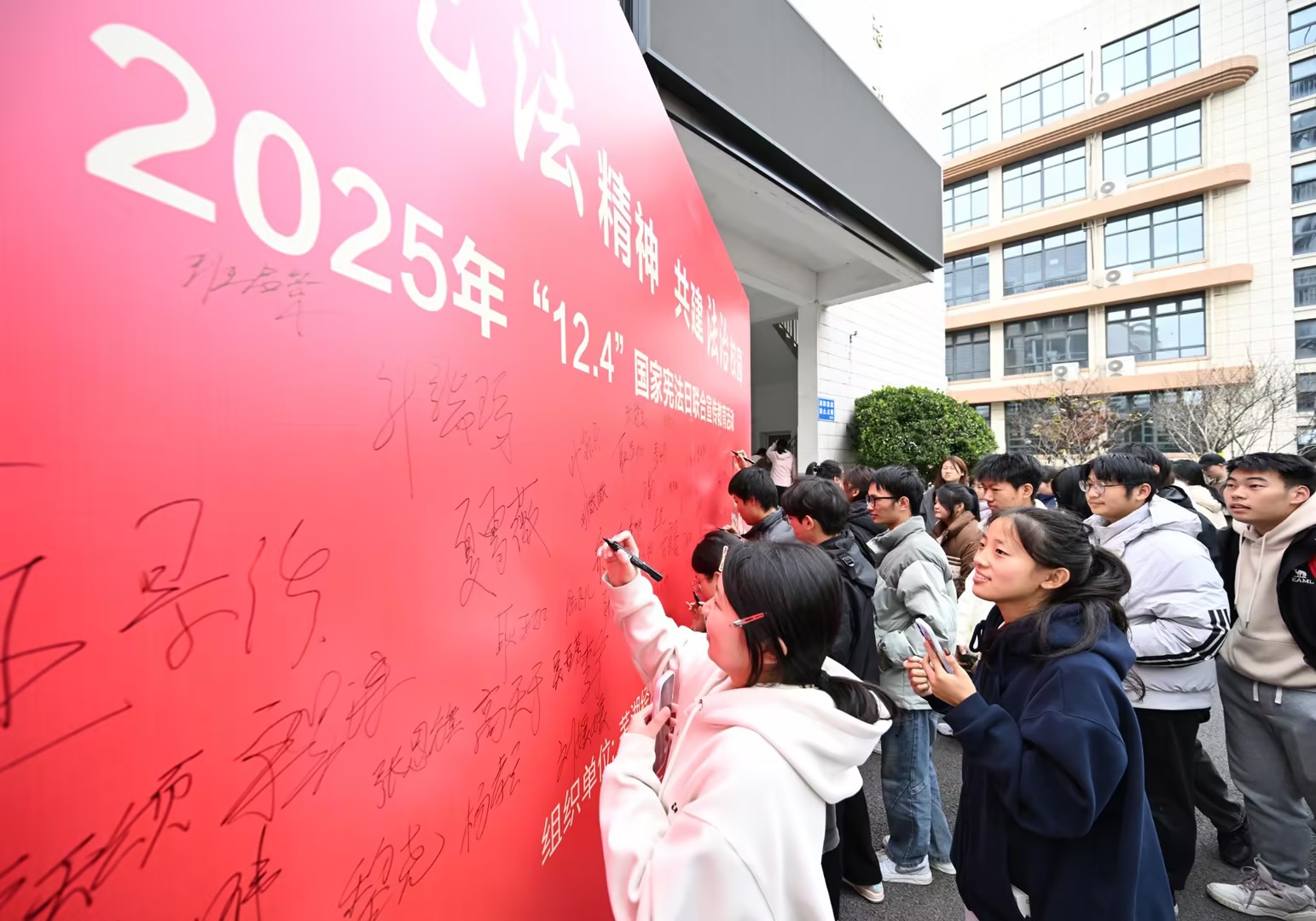 与此同时,“弘扬宪法精神,共建法治校园”签名活动同步开展。学院共建单位龙湖社区设置主题签名墙,往来师生及活动参与者纷纷驻足,在签名墙上郑重签名,以实际行动表达尊崇宪法、学习宪法、遵守宪法、维护宪法、运用宪法的坚定决心。签名活动持续全天,成为校园内一道彰显法治精神的亮丽风景线。