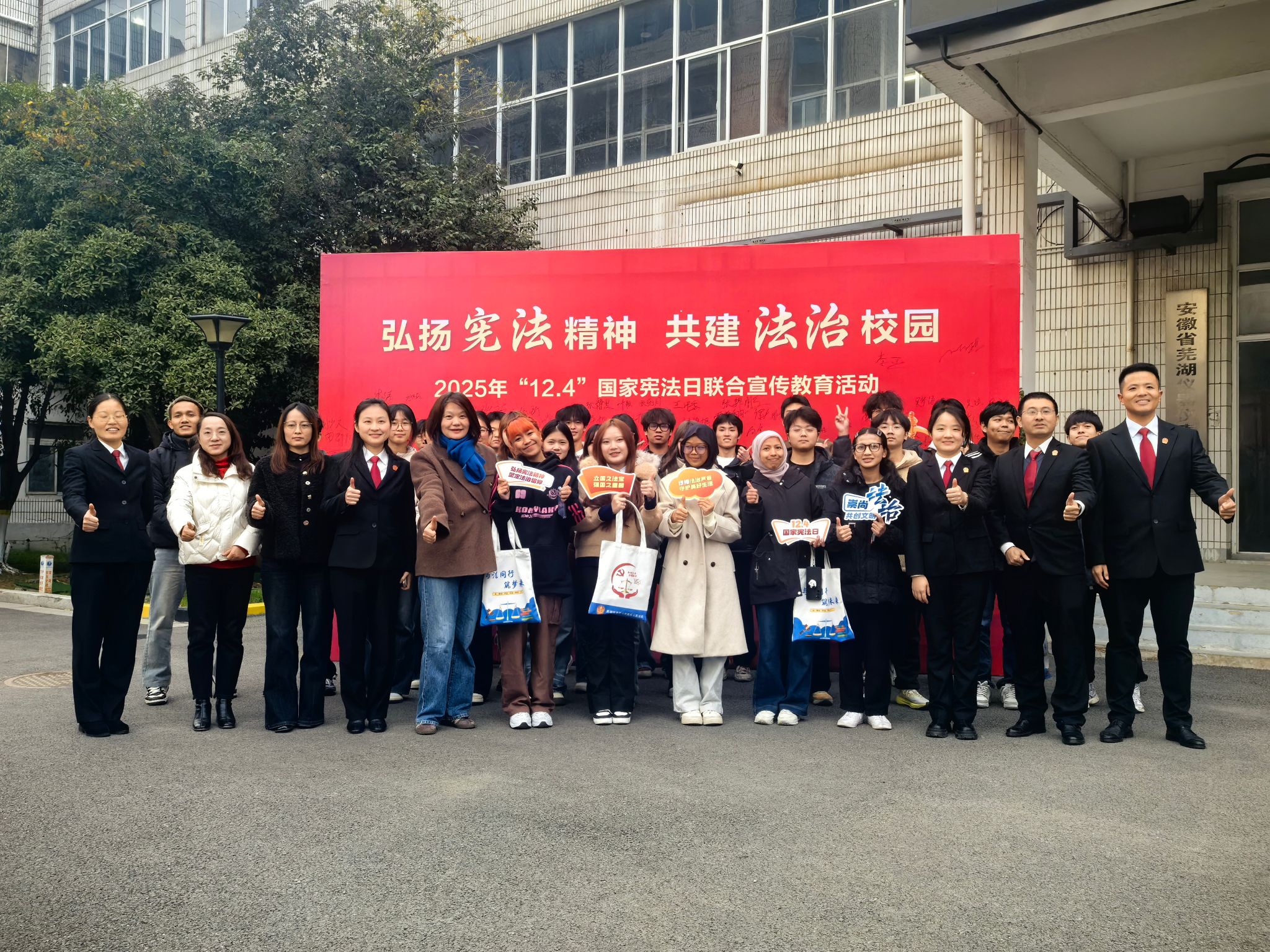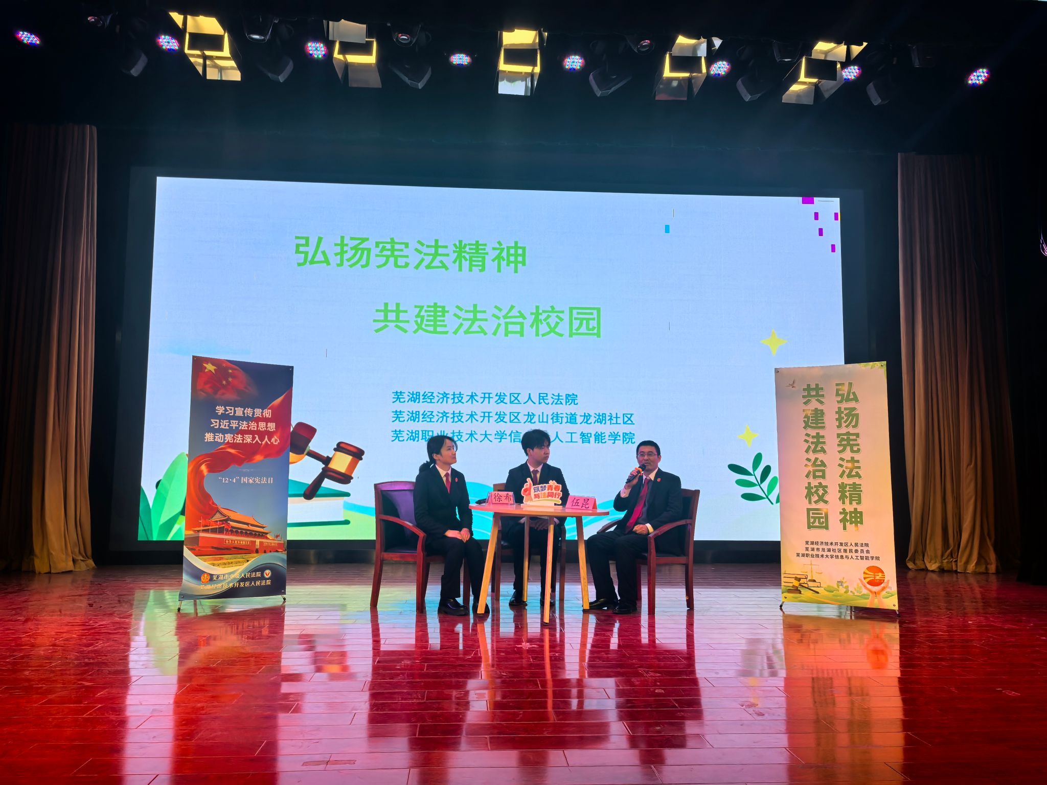 12月4日,由信息与人工智能学院联合芜湖经济技术开发区人民法院、芜湖经济技术开发区龙山街道龙湖社区共同主办的“弘扬宪法精神,共建法治校园”主题宣传教育活动在我校银湖校区举行。经开区法院政治部主任、党总支副书记张玮玮,龙湖社区党委副书记秦芳芳,信息与人工智能学院党总支书记杨琦、副书记查静芳等出席活动,学院入党积极分子、2025级新生及国际生代表共200余人参加。本次活动围绕“弘扬宪法精神,共建法治校园”主题展开,旨在通过讲座、互动问答、签名承诺等形式,普及宪法知识,营造尊法学法守法用法的浓厚氛围。
